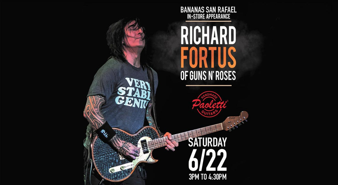 Richard Fortus, guitarist of Gun N' Roses, will make a special in-store appearance for a meet-and-greet at Bananas at Large on Saturday, June 22 at 3pm. He will be showing off his Paoletti Richard Fortus signature model guitar, as well as sharing a few stories from his varied career. Richard has played with everyone from Enrique Iglesias, Rihanna and N’Sync to Thin Lizzy, The Psychedelic Furs and The Crystal Method. He has been with Guns N’ Roses for the last 18 years and is presently on a break from the current “Not In This Lifetime” tour (one of the highest grossing tours in history).