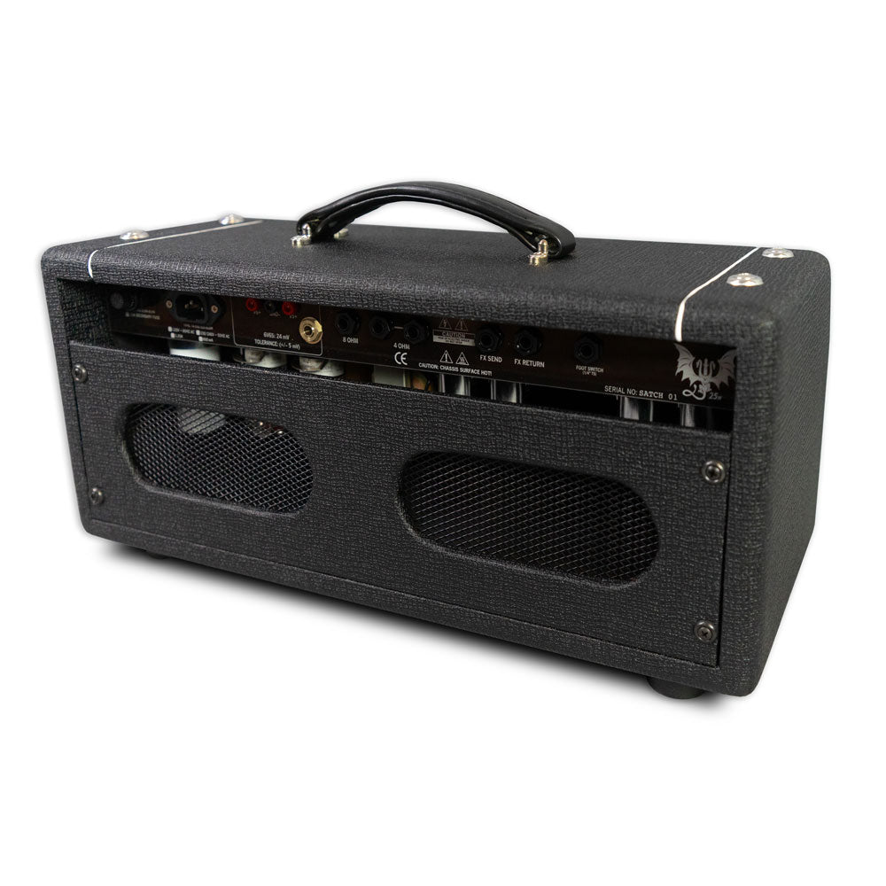 Available in either a stand-alone head version as well as a 112 combo, the DRAGON 25 employs vintage-style, paper-bobbin transformers throughout. The laydown mains transformer delivers 440V to a pair of JJ 6V6 output tubes. A blend of four hand-selected JJ (ECC83S) and Sovtek 12AX7LPS dual triode preamp tubes are called into action performing as follows: Vintage Plexi Mode, High Gain Cascade Mode, Class-A Cathode-follower Tone Stack, Tube buffered FX Loop, and finally, the Phase Inverter. Robust electrolytic capacitors provide the internal circuitry with clean, filtered high voltage.