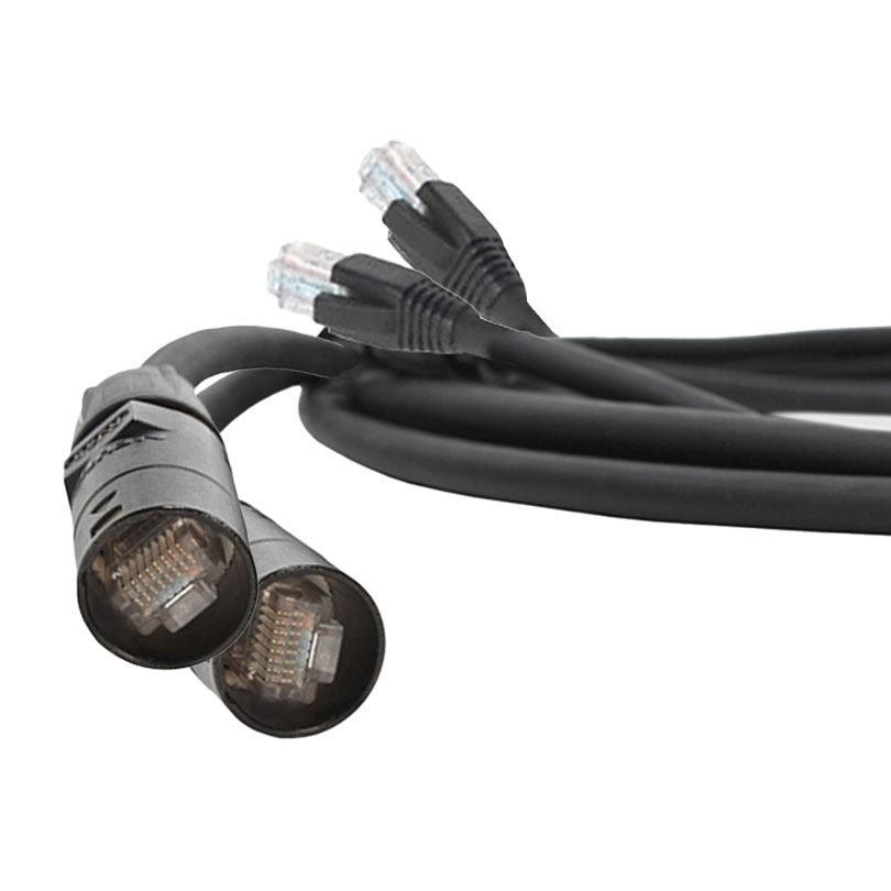 150 foot Rapco Horizon Dual Channel Duracat Cat6 Solid Core UTP cable with a standard size RJ45 connector on one end and Rugged Neutrik EtherCon connector on the other. Gauge: 23awg.