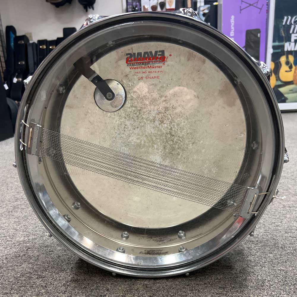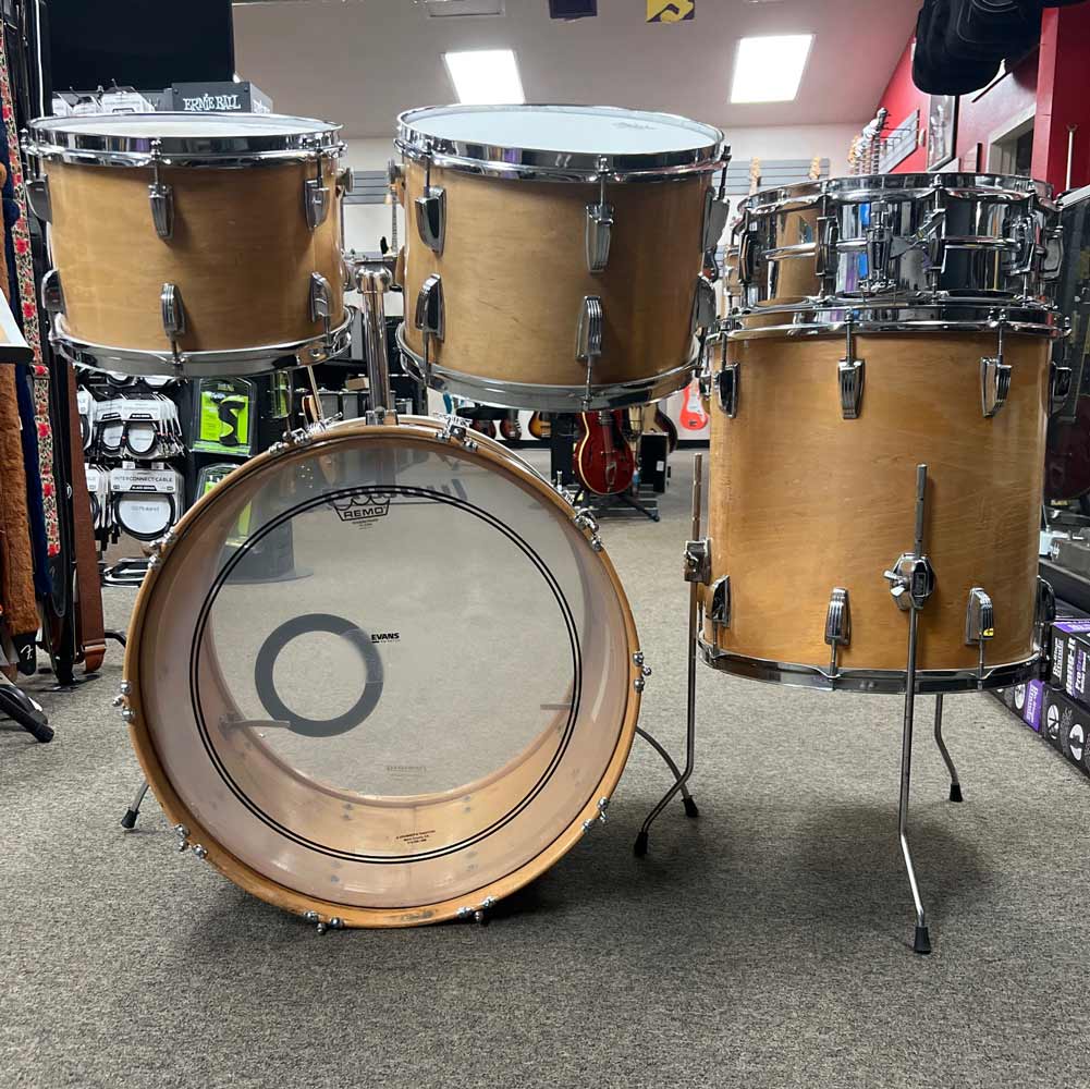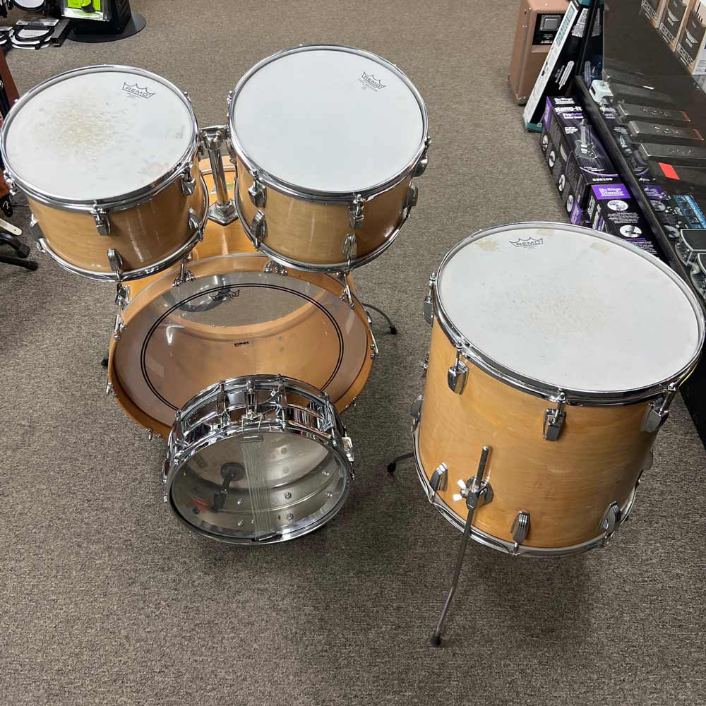 This vintage drum kit includes a 22 in. bass drum, 12 in. and 13 in. rack toms, a 16 in. floor tom, and a 14 in. Supraphonic snare.