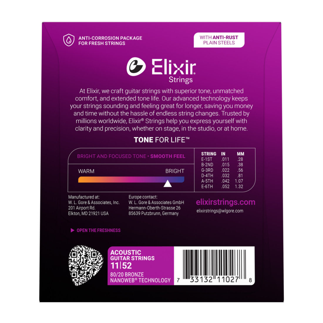 Elixir 11027 80/20 Bronze Acoustic Guitar Strings w/ Nanoweb Coating - Custom Light 11-52