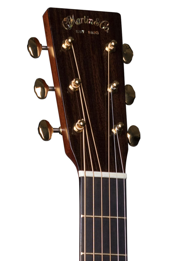 This guitar is packed with custom features and modern technology that you have to see, feel, and hear for yourself. The vintage appointments include a Sitka spruce Vintage Tone System (VTS) top, a dovetail neck joint, and natural protein glue construction that give it the rich, fully aged Martin tone that has inspired generations. The look is unlike anything in our production line to date with East Indian rosewood binding, stylish gold frets, gold open-gear tuners, and a unique 1930s style script logo inlaid in pearl on the headstock. Some ultra-modern features include Liquidmetal® bridge pins with red dots and a composite carbon fiber bridgeplate that boosts volume. And we’ve included a new neck shape that is slightly asymmetrical for maximum hand comfort up and down the fretboard. This guitar is anything but standard.