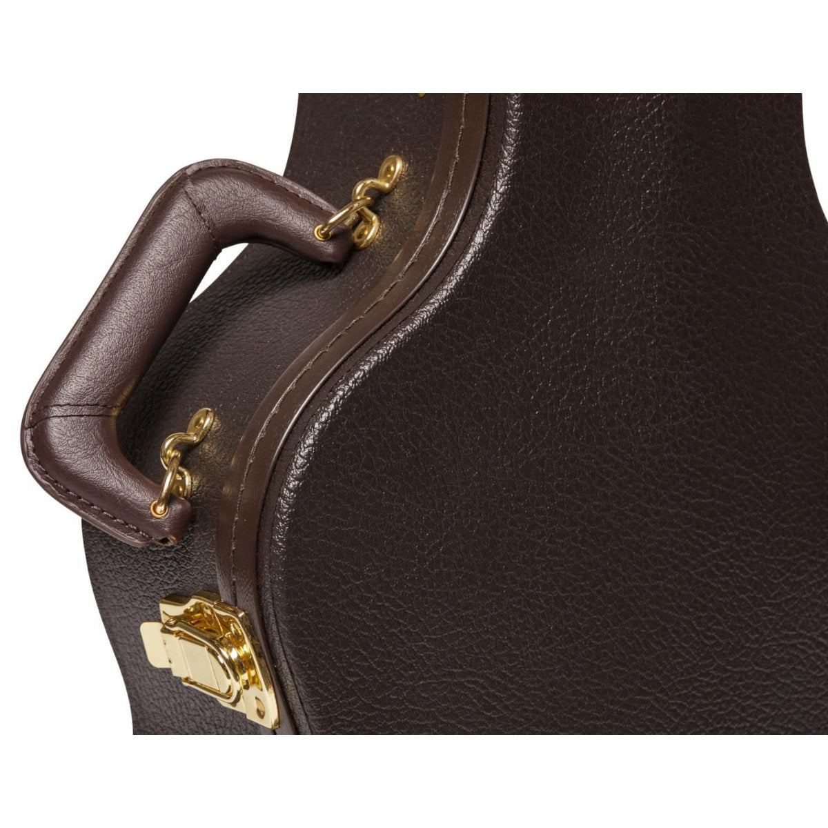 - Includes double neck cradles and shape-specific body contours, a padded handle, brass-plated latches, bottom and side feet, and accessories compartment