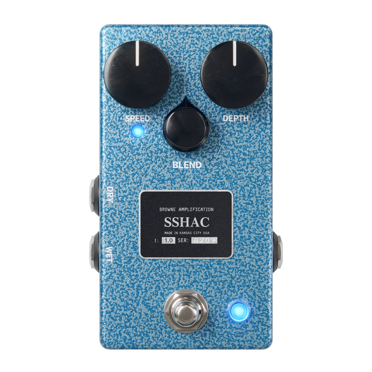 The SSHAC, or "Sky Snake Hawk Attack Chorus" was born out of Browne's desire for an analog bucket brigade chorus pedal that felt just out of reach. Browne set out to build upon all the things they loved from the classics by breathing new life into what they feel is the perfect chorus. This included making sure the SSHAC retained low end, has no volume drop, & giving you access to faster “rate” speeds.