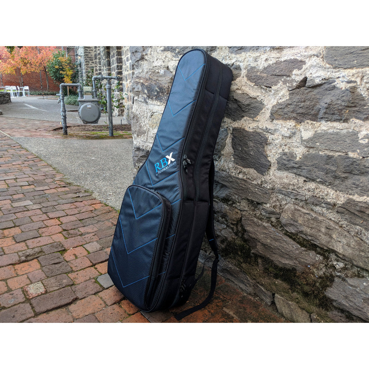 Reunion Blues has been making the world's best gig bags for almost 40 years, and the RBX gig bag line represents a fusion of Reunion Blues's passion for quality and the desire to make an affordable, lightweight, and protective gig bag perfect for musicians on the go. The essence of this passion is represented in it's sleek aesthetic design, from the Quilted Chevron exterior to the padded Blue Luster lining. The RBX protection system features a lightweight multi-layer foam surround with strategically placed impact panels, and a dense foam neck cradle and endpin rest that keep the guitar safe and secure. Padded backpack straps, an integrated subway grip, and Reunion Blues signature Zero G handle make getting around town a breeze. A large but low profile pocket includes a cable loop and organizer and provides ample storage without adding bulk. And best of all, the RBX gig bag features Reunion Blues Limited Lifetime Warranty. The Gig Bag, Reinvented.(tm)