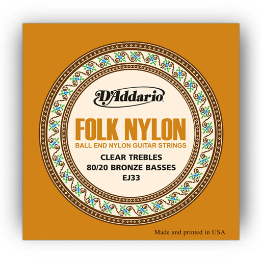 EJ33 Folk Nylon strings feature 80/20 bronze basses clear nylon trebles and D'Addario ball ends to accommodate a variety of guitars and string changing options.