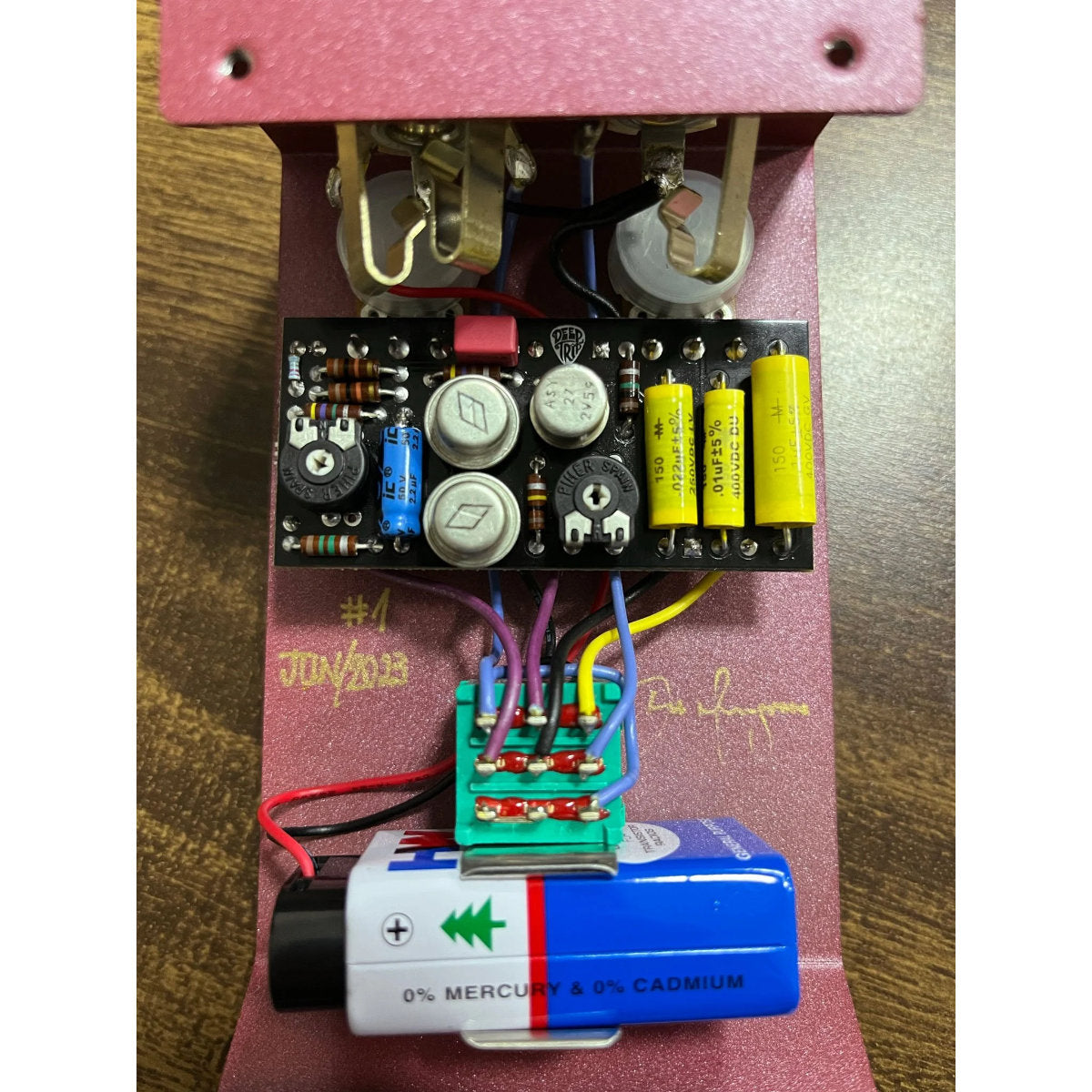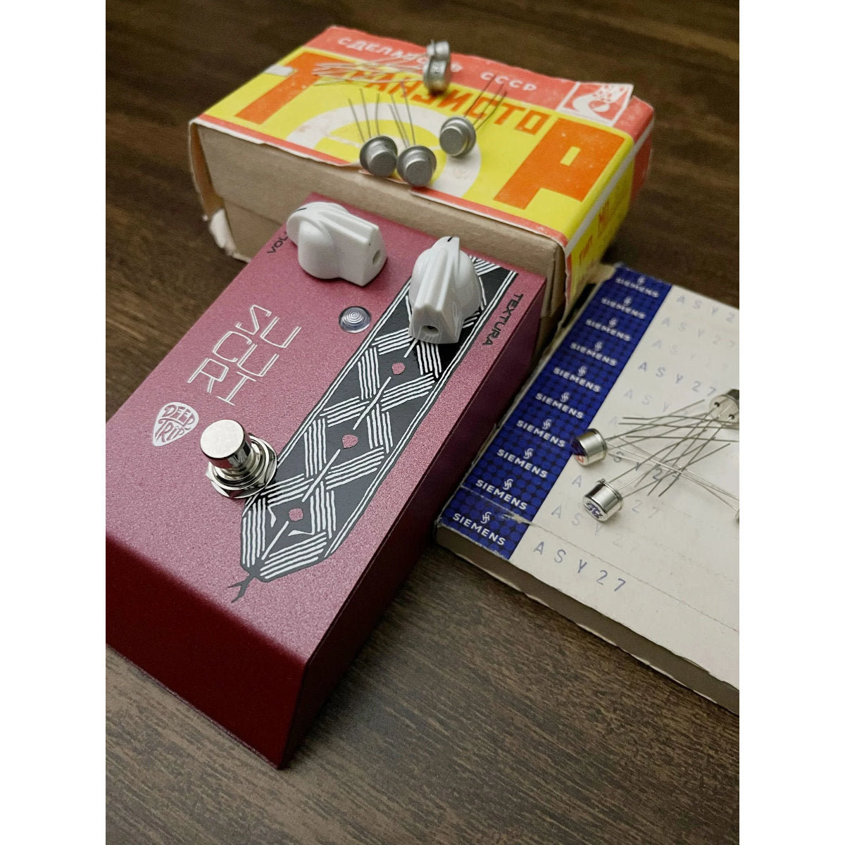 The Sucuri sound is delivered by a couple of NOS MP26A germanium transistors (made in former USSR between 1979 and 1986, that was bought in factory sealed boxes) and a single NOS ASY27 transistor made by Siemens in West Germany in the 1970’s (mostly bought in factory sealed boxes as well). These pedals also contain Mallory 150 capacitors, Switchcraft connectors and G0rva Mechano footswitches (more reliable, but with softer click); and are offered with the choice of vintage-syle carbon comp resistors or modern, more reliable metal film resistors. Even the wires are special, they’re importing pre-bonded spools, more rigid, for a cleaner assembly. Fancy stuff!The idea for this project was born in the peak of the pandemic, when they weren’t able to offer their traditional line of pedals. That’s why it is soldered exclusively by Du Menegozzo (Deep Trip founder and developer of all circuits): He solders all the boards, and assembles the wiring with much care and planning, no margin for errors. It’s Deep Trip custom shop.