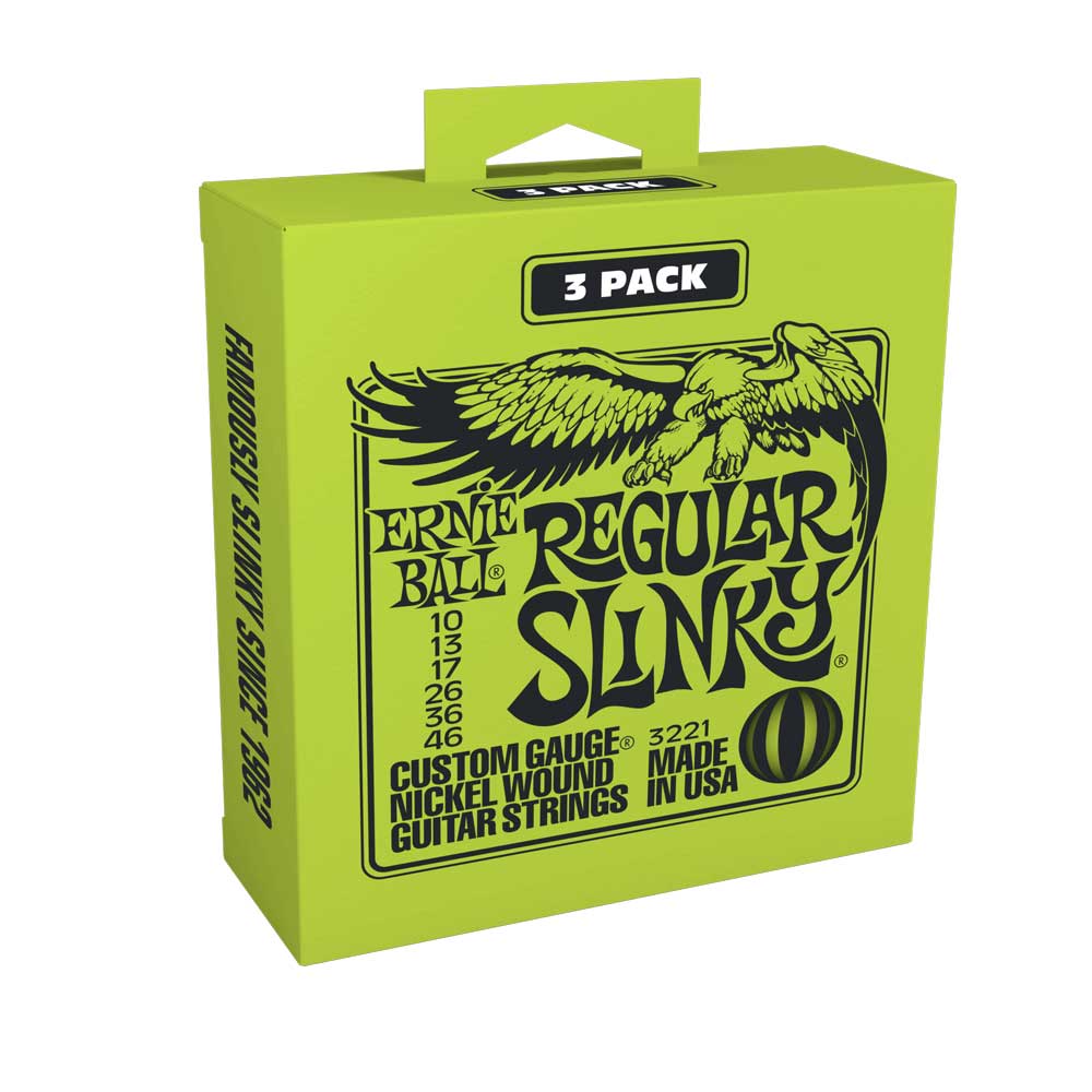 Now available in convenient three-set packs Ernie Ball Regular Slinky Electric Strings are our top selling set, and are favored by many musicians around the globe. Regular Slinky strings are played by Eric Clapton, John Mayer, Steve Vai and legions of guitar players worldwide These strings are precision manufactured to the highest standards and most exacting specifications to ensure consistency, optimum performance, and long life. Regular Slinky wound strings are made from nickel plated steel wire wrapped around a hex shaped steel core wire. The plain strings are made of specially tempered tin plated high carbon steel producing a well balanced tone for your guitar.
