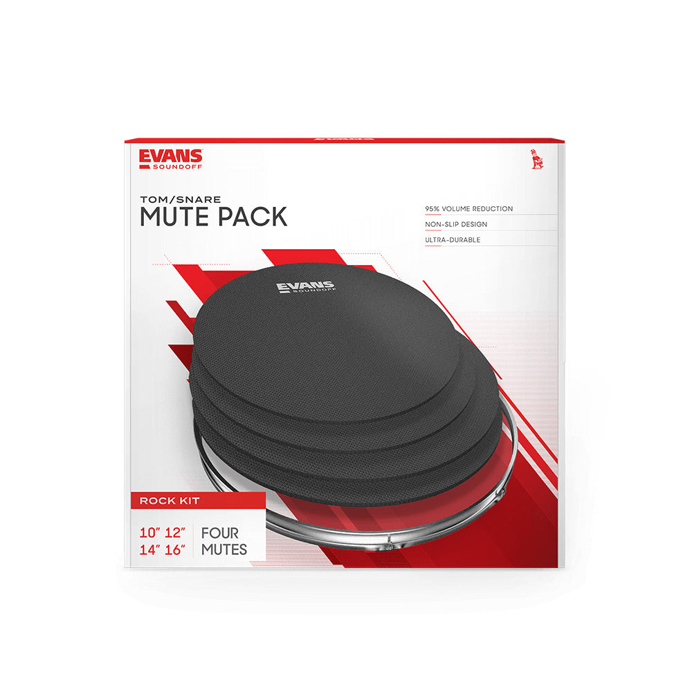 The Evans SoundOFF Rock Tom/Snare Mute Pack significantly reduces volume while you practice on your acoustic drum set.