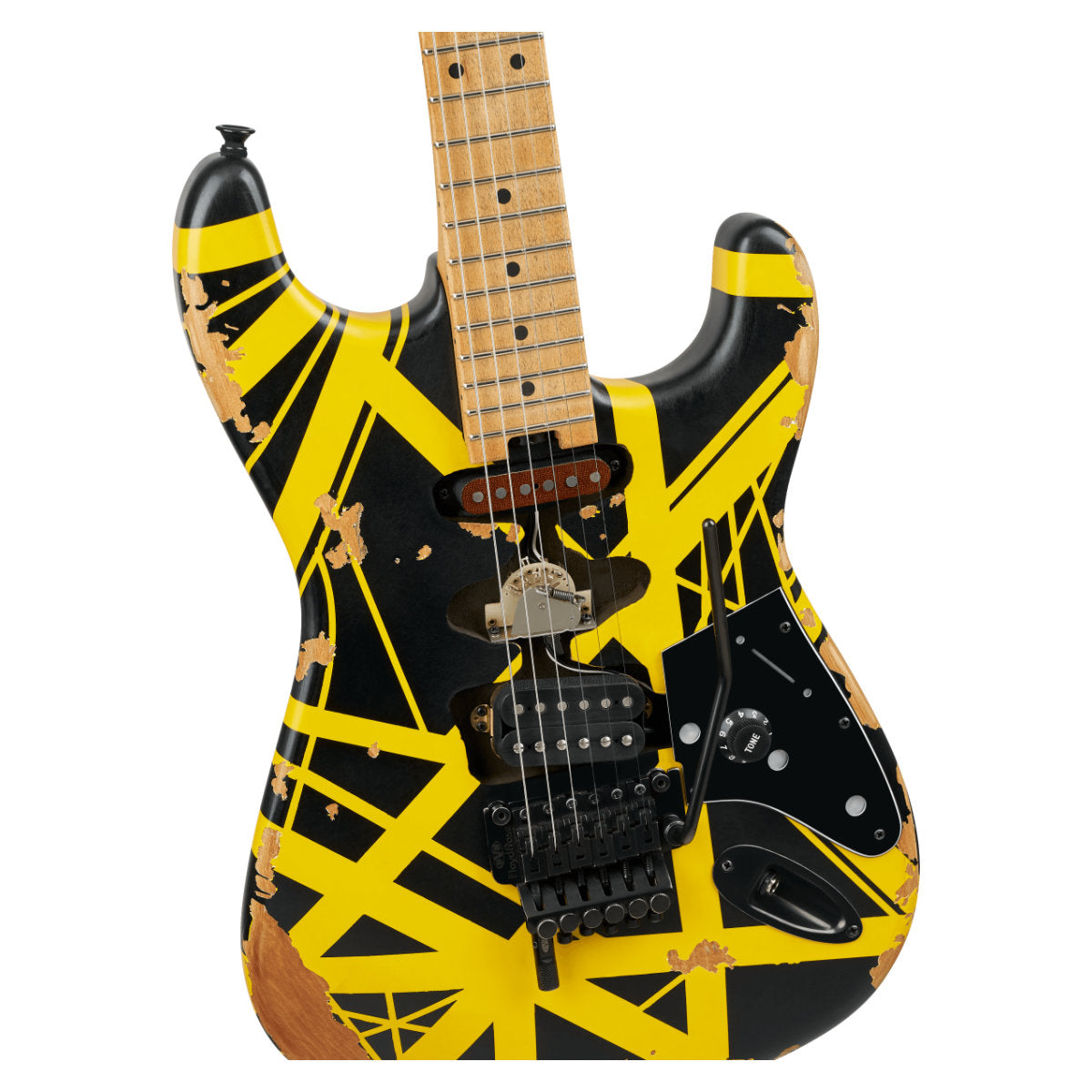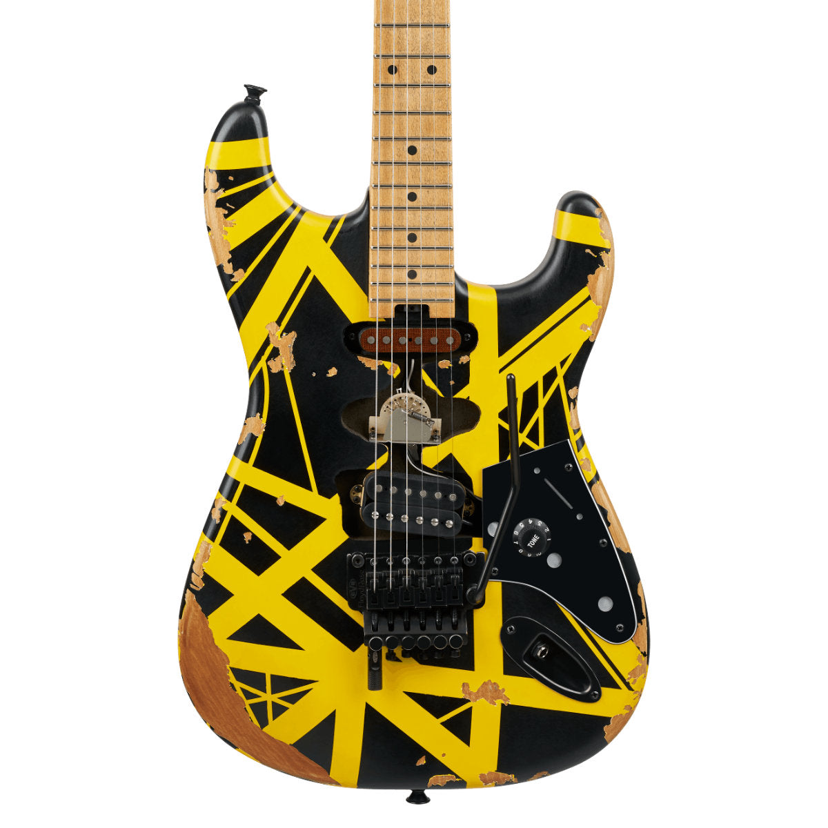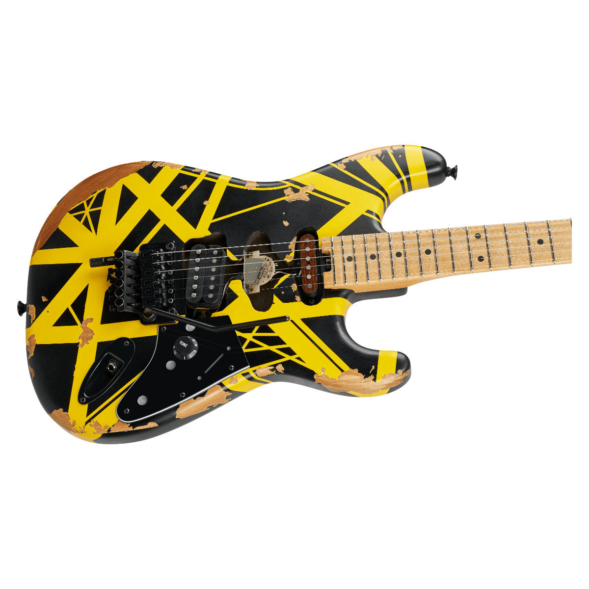 Other unique features include a black skirted Strat-style single push/push volume control knob (labeled "tone"), custom black pickguard, distressed black hardware, oversized strap buttons and EVH neck plate.