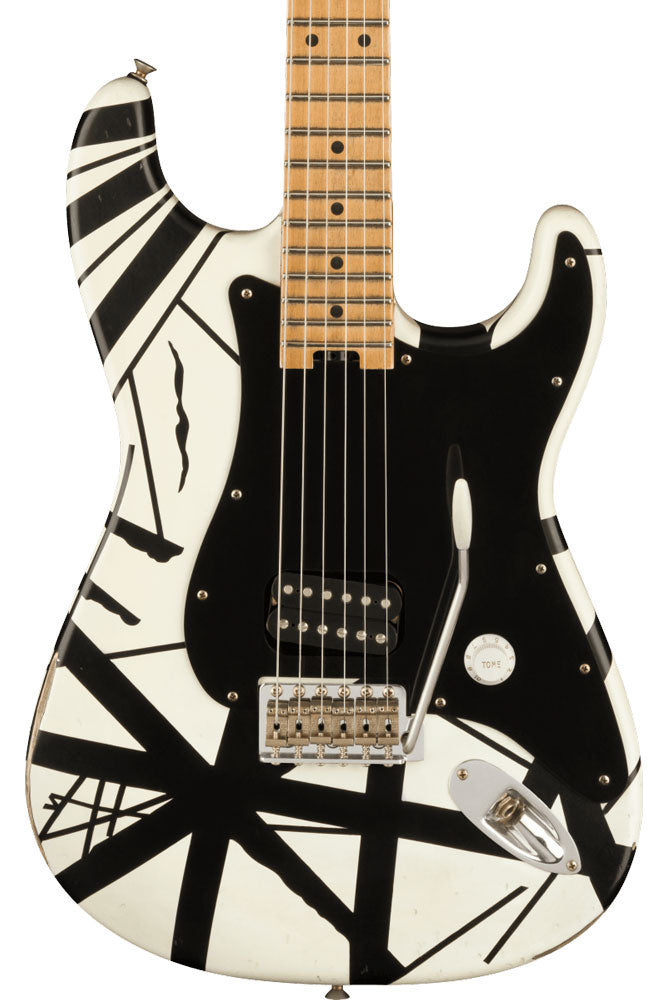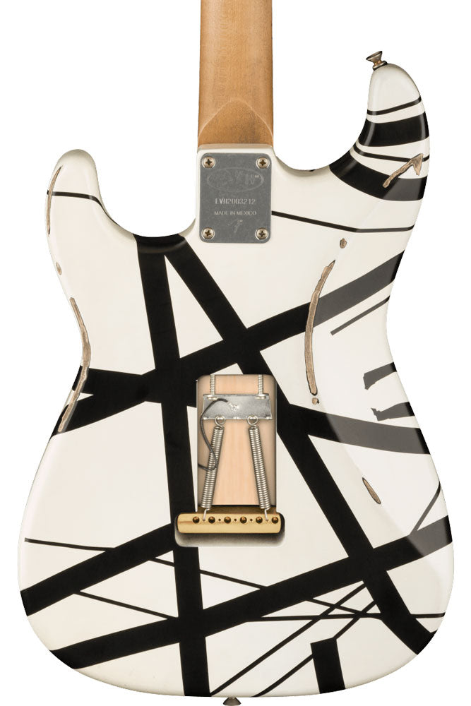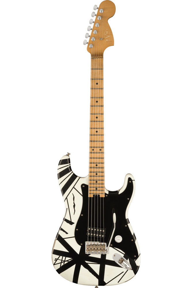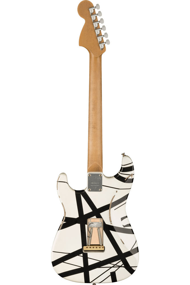 The Stratocaster®-style body sports Eddie’s famed white-and-black-striped paint job and has been paired to a quartersawn maple neck with a hand-rubbed satin urethane back finish. The 12”-16” compound radius maple fingerboard with 22 jumbo frets was designed for fast and furious playing styles with maximum comfort, while a heel-mount truss rod wheel makes for time-saving neck adjustments.