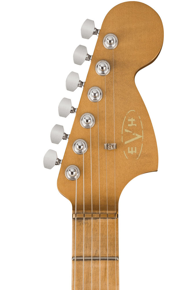 Other features include a skirted white Strat-style volume control knob (labeled “tone”) with 500K EVH Bourns® low friction pot and treble bleed circuit, black pickguard, chrome hardware, oversized strap buttons, EVH neck plate and larger, ‘70s-style licensed Fender Strat headstock with gold EVH logo.