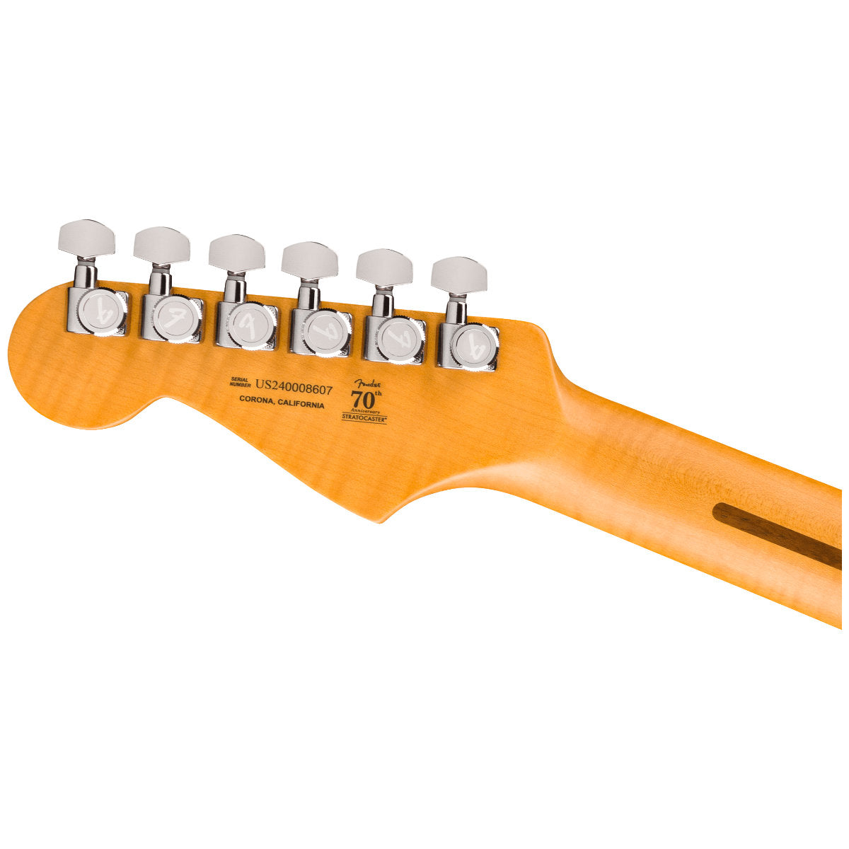 The Fender® American Ultra II Stratocaster® HSS features a select alder body with sculpted body contours. For effortless playability, the quartersawn maple neck features Fender's Modern D profile and smooth Ultra Satin finish. Ebony or quartersawn maple 10”-14” compound radius fingerboards feature Ultra rolled edges, medium-jumbo frets, Luminlay® side dots and Graph Tech® TUSQ® nuts. The tapered neck heel and sculpted body contours allow unparalleled access to the higher register.