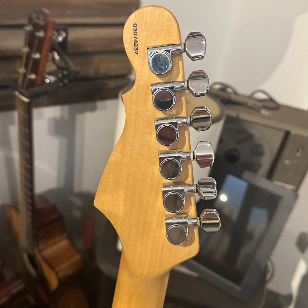 This G&L Tribute Legacy features a solid S-Style body, a hard-rock maple neck, rosewood fingerboard, classic single-coil pickups, and a vibrato bridge.