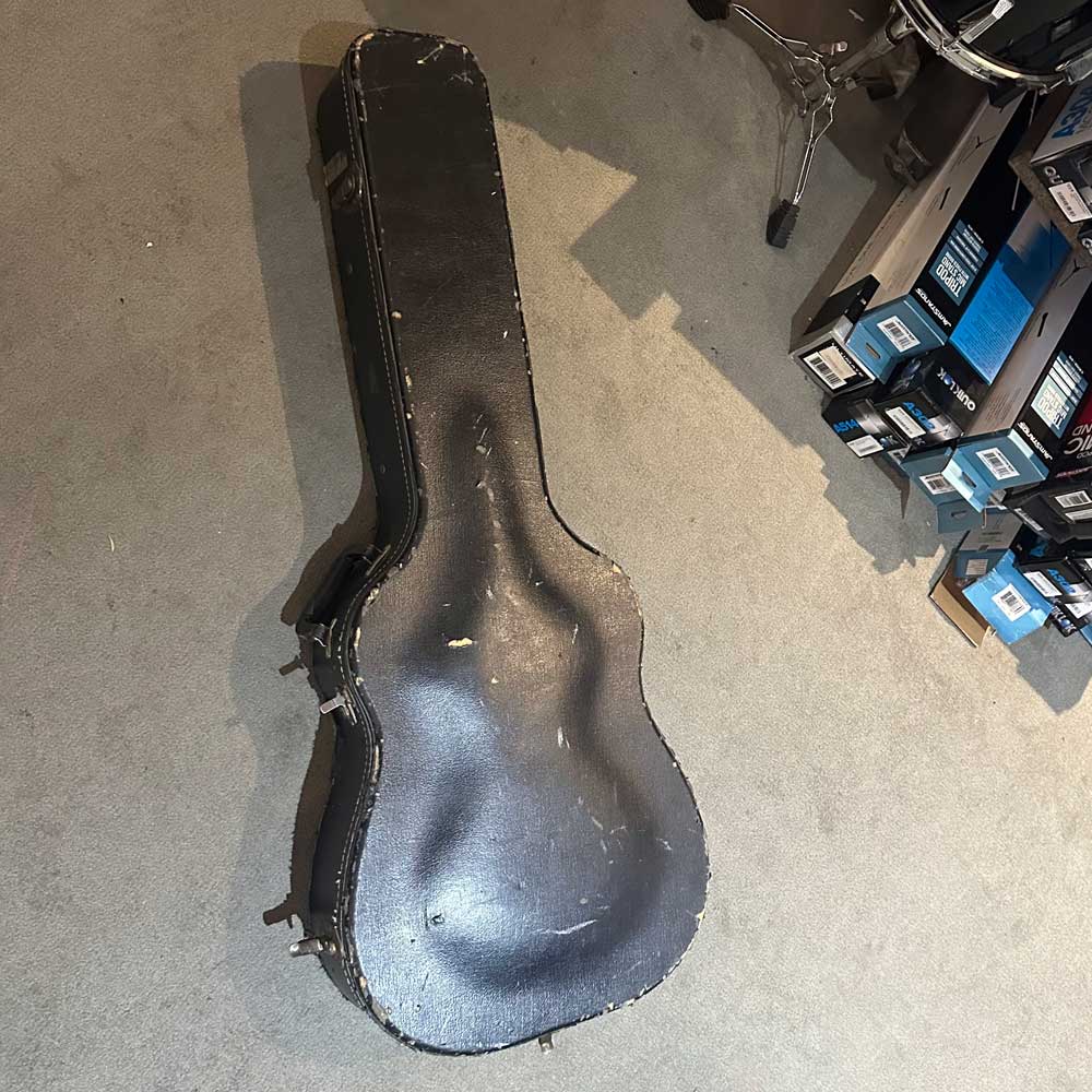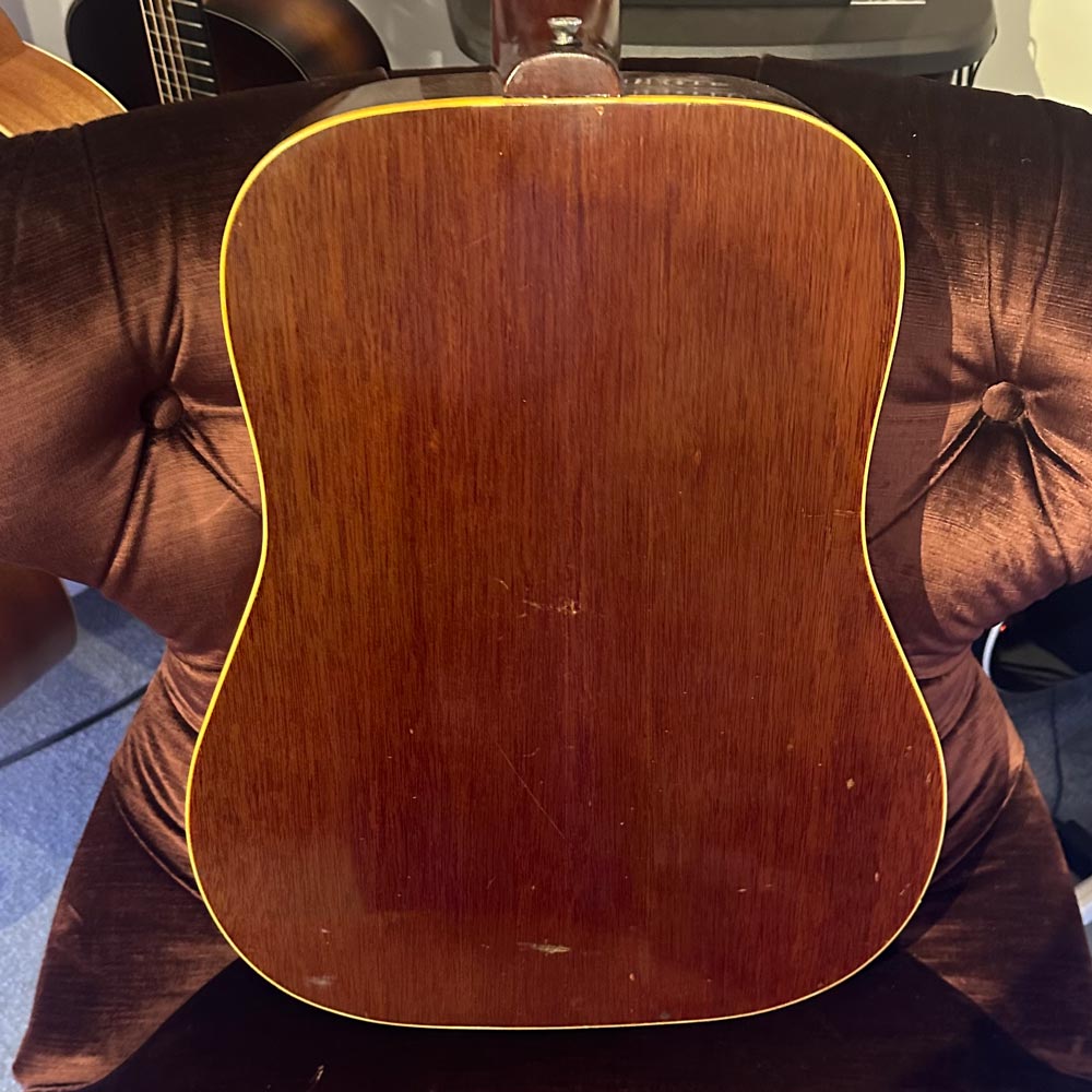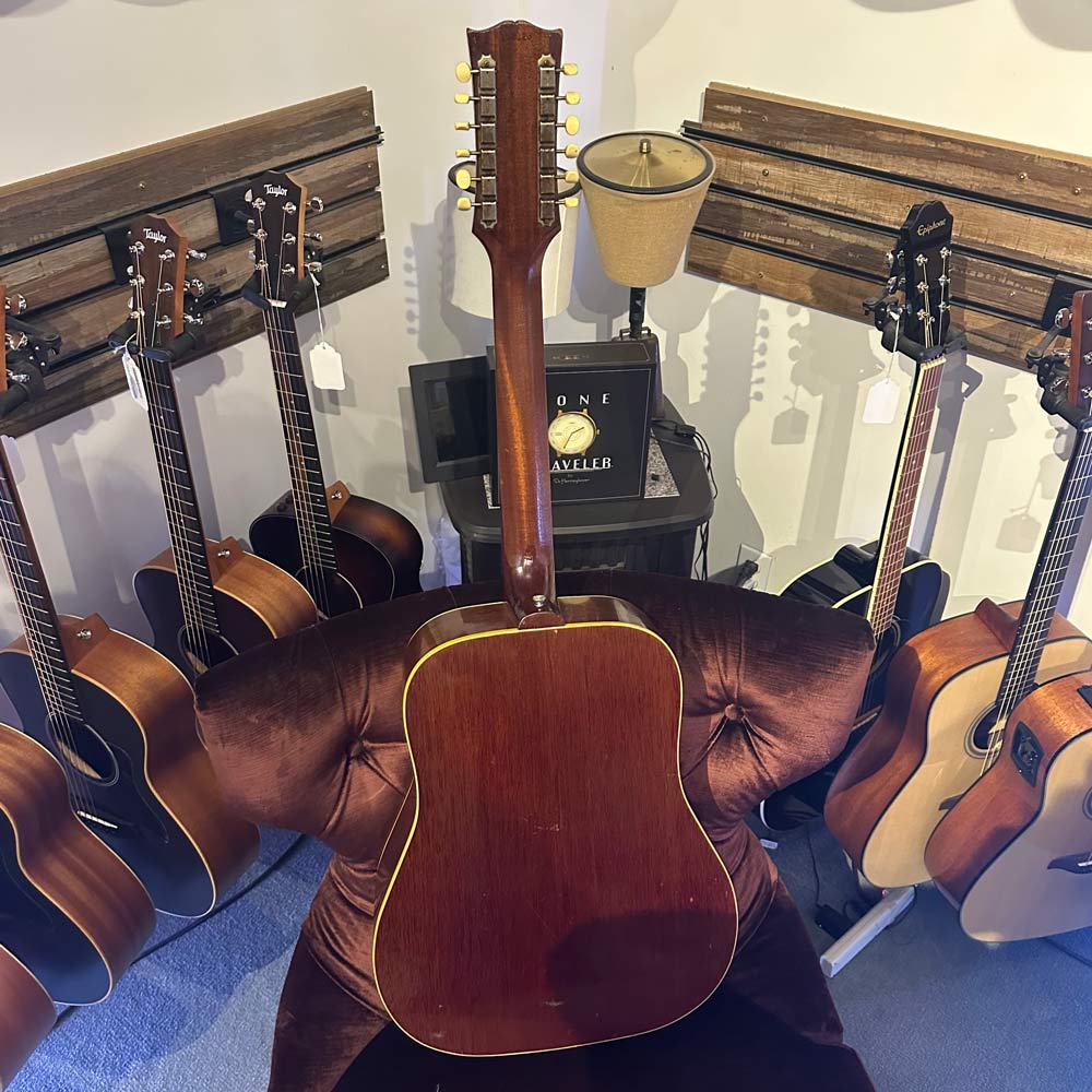 This Kalamazoo era Gibson B-45-12-N is a 12-string guitar featuring a spruce top, mahogany body and neck, rosewood fingerboard, square shoulders, and a natural finish. A case is included. Electronics are included. The back of the neck has been refinished and reshaped with a V profile. This guitar is in Fair Condition.