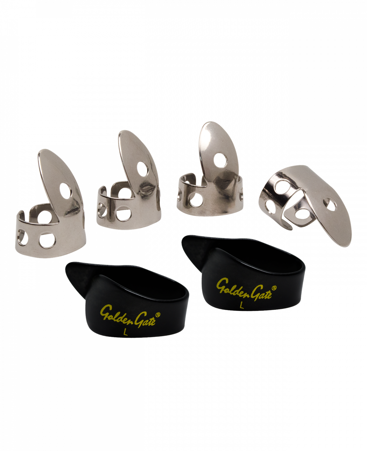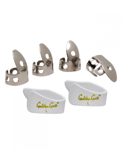 Golden Gate ABS thumb picks and metal finger picks have been popular with fretted instrument players for generations. Combining the two together and you’ve got a great pick combination!
