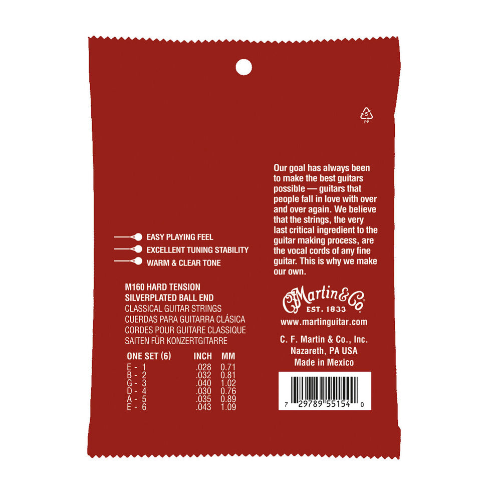 Martin Classical strings offer an easy playing feel, excellent tuning stability and a warm clear tone. These strings are made of crystal nylon and are offered in a silver plated hard tension and 80/20 bronze normal tension ball end for ease of stringing up your classical guitar.