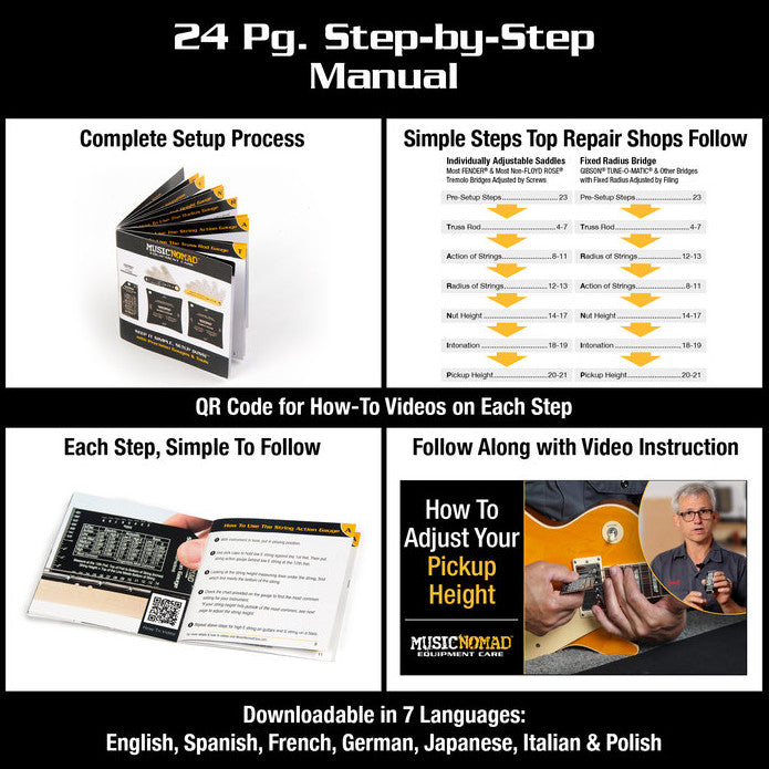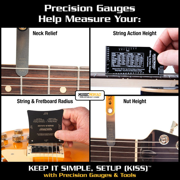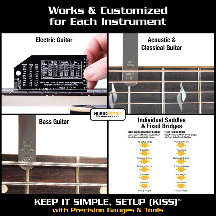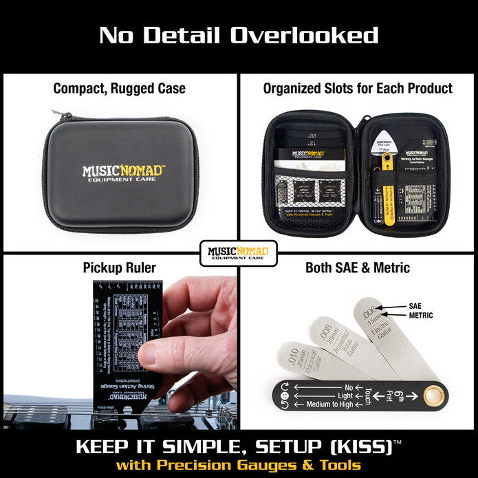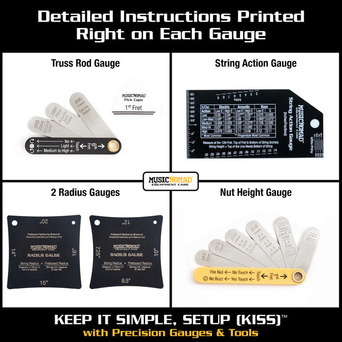 - 24 Page Instructional Booklet & Carrying Case Included. Check Out All MusicNomad's “How-To” Videos. This Gauge Set is Part of their KEEP IT SIMPLE, SETUP (KISS)™ Method using their Precision Gauges & Tool Sets
