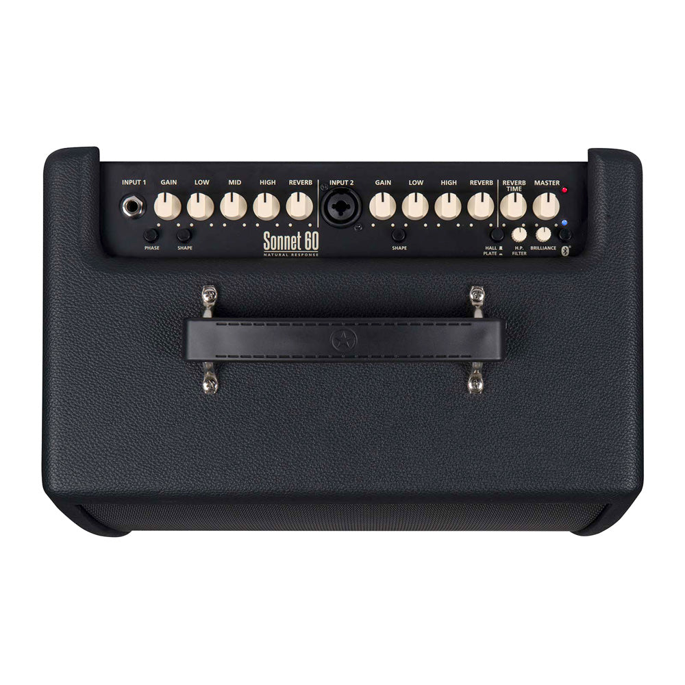 The Sonnet 60 is the ideal grab-and-go acoustic combo. This light weight, compact and feature laden 60 Watt, 1x6.5 + tweeter combo is perfect for all your acoustic gigging needs. With microphone and instrument channels with independent EQ and REVERB levels, stunning studio quality reverbs: HALL and PLATE, High Pass Filter, Brilliance control, USB audio out, XLR D.I. mix output, MP3/Line in, Bluetooth audio, footswitch socket for audio mute and REVERB on/off and Tilt-back stand for ultimate sound projection.