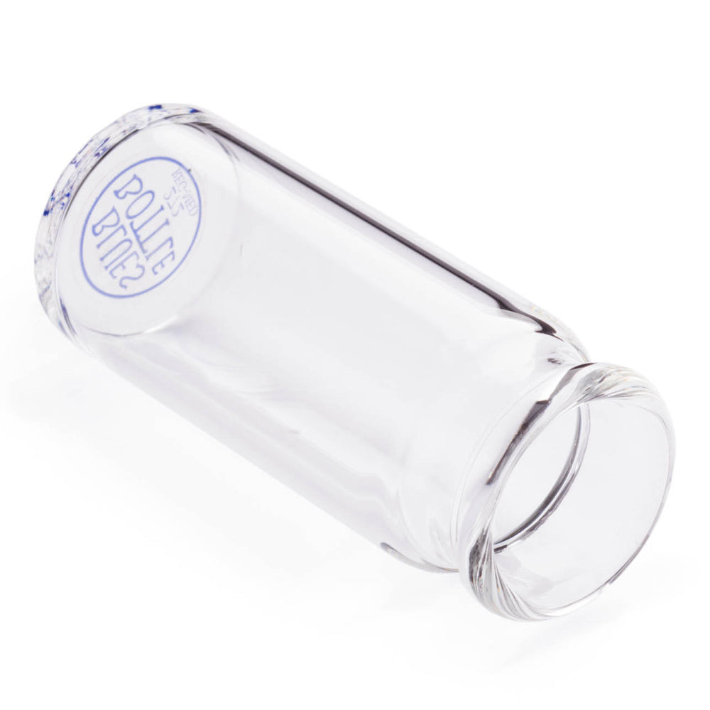 This glass medicine bottle slide provides a crisp, bright tone, featuring a closed, weighted end for balance, regular wall thickness, and a medium diameter.