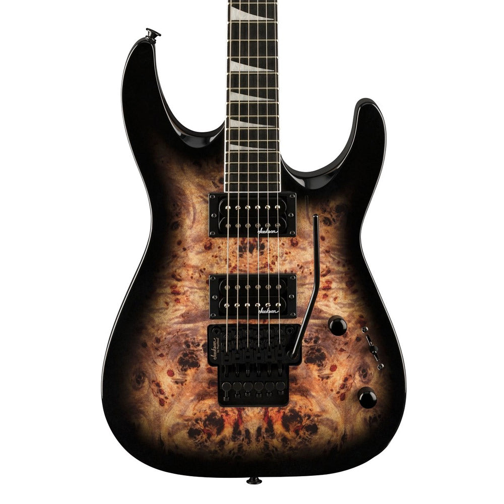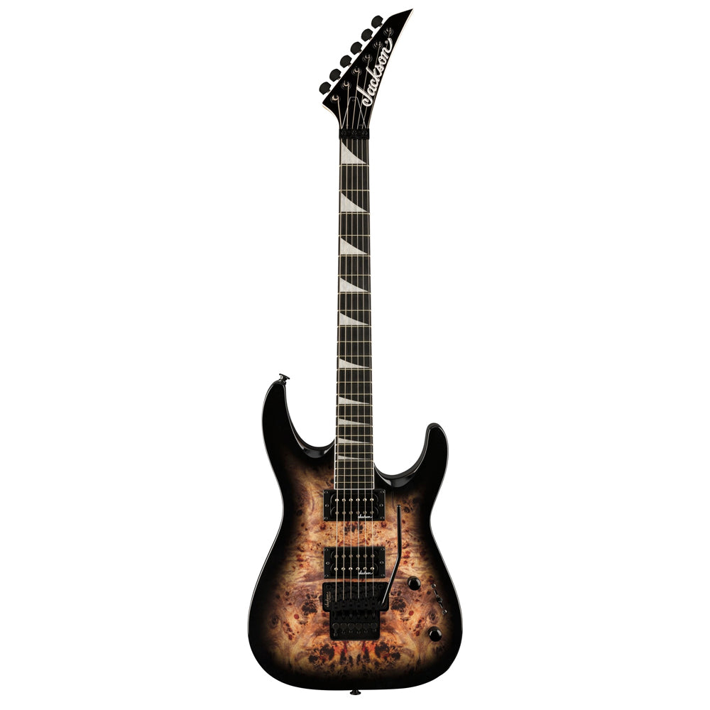 Dual Jackson high-output humbucking pickups with ceramic magnets erupt with hot, crunchy tone perfect for any flavor of hard rock or heavy metal. Dial in tone to your preference with three-way blade switching and single volume and tone controls, and wail away at will as the Jackson-branded Floyd Rose® licensed double-locking bridge provides dynamic trem action with tuning stability.