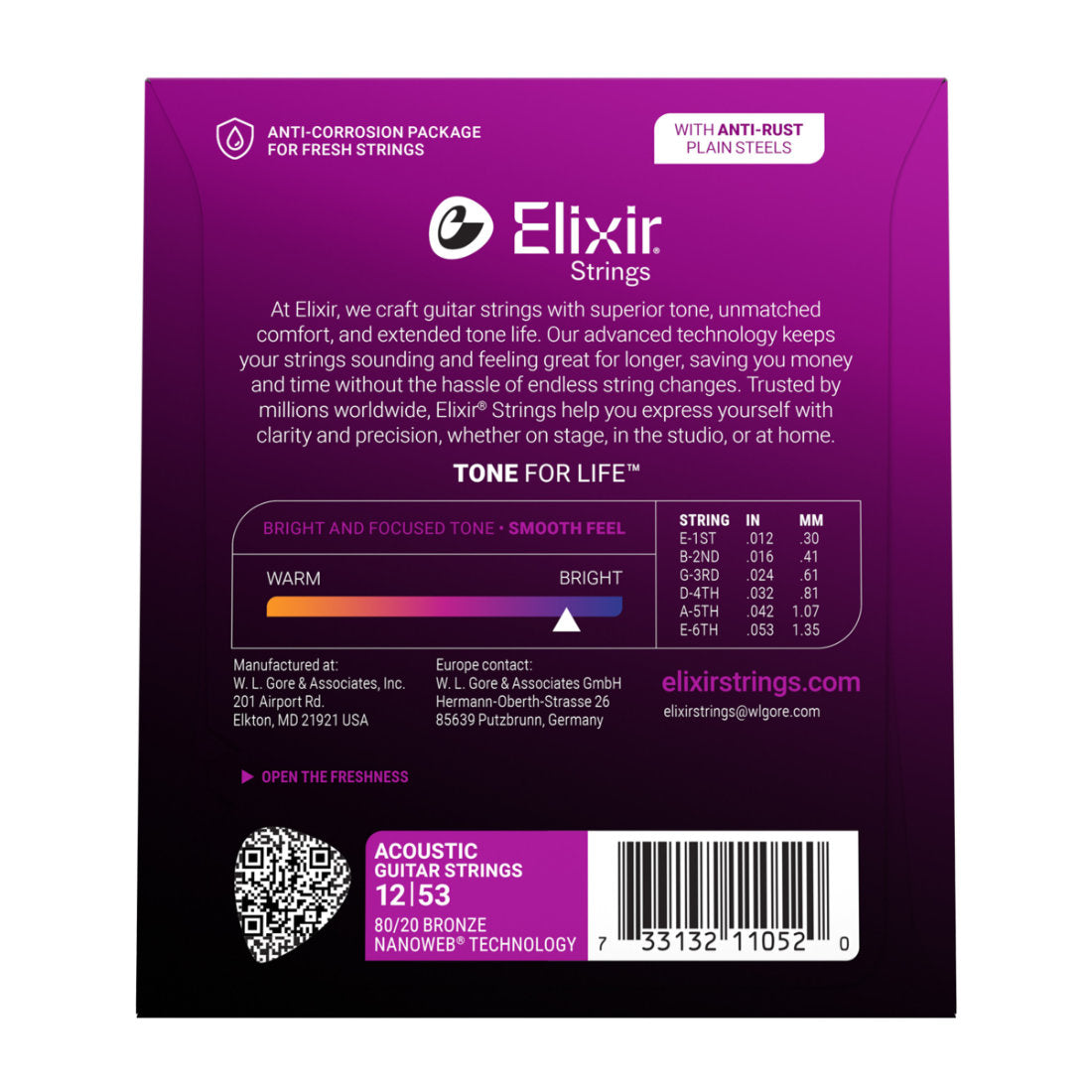 Elixir 11052 80/20 Bronze Acoustic Guitar Strings w/ Nanoweb Coating - Light 12-53