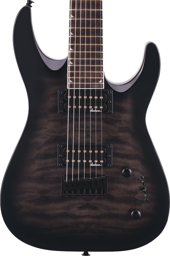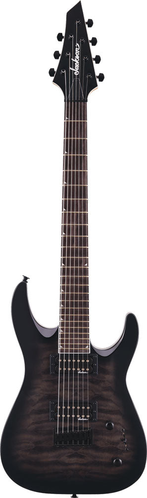 A formidable 7-string beast, the JS Series Dinky Arch Top JS22Q-7 DKA HT is wrapped in a brooding Transparent Black Burst finish with all-black hardware and our Jackson 3x4 AT-1 black headstock.
