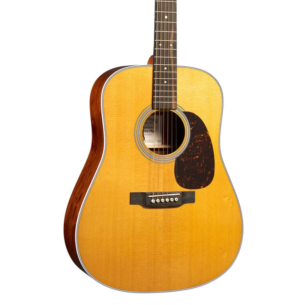 Meet your brand-new old friend. The Martin DE Retro Plus Granadillo is inspired by our legendary 28-style models and brings timeless design together with modern craftsmanship. Its torrefied solid spruce top is thermally aged for a broken-in sound with bold projection and vintage character right out of the box. Paired with solid granadillo back and sides, it delivers powerful bass, clear highs, and long, rich sustain—everything you expect from a classic Dreadnought. Scalloped X-bracing adds dynamic punch, while a Performing Artist neck and ebony fingerboard make it easy and comfortable to play. Finished with Style 28 details and LR Baggs Element electronics, this stage-ready workhorse is built for players chasing tone, power, and performance—wherever your road leads.
