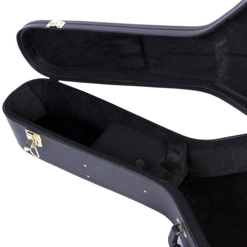 Road-ready hardshell guitar case custom molded to fit acoustic guitars. Holds 6 or 12-string instruments. Black vinyl, black plush lined, gold-plated hardware.