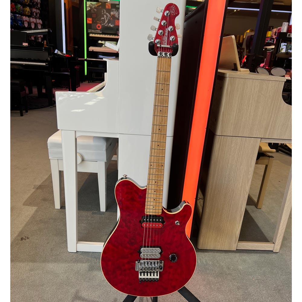 From the Private Collection of one of the world's greatest guitarists, Joe Satriani, this Music Man Eddie Van Halen EVH Signature Model with Upgrades in Quilt Red finish features a solid basswood body with a bookmatched quilted maple top, a birdseye maple neck and fingerboard, a 25.5 in. scale, a Saturator Bridge Pickup, a custom Neck Pickup, a 3-way toggle, and a Single Tone Control. It also includes a Music Man-licensed Floyd Rose double locking tremolo system, Schaller tuning machines with pearl buttons in a 4+6 arrangement, and custom asymmetrical neck profile.