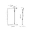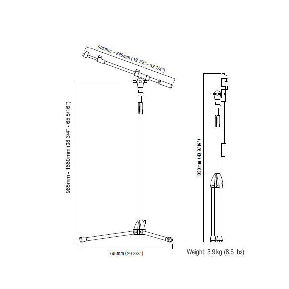 - Height: 985–1,660mm (38 3/4"–5 3/8")Arm: 505-845mm (19 7/8"-33 1/4")