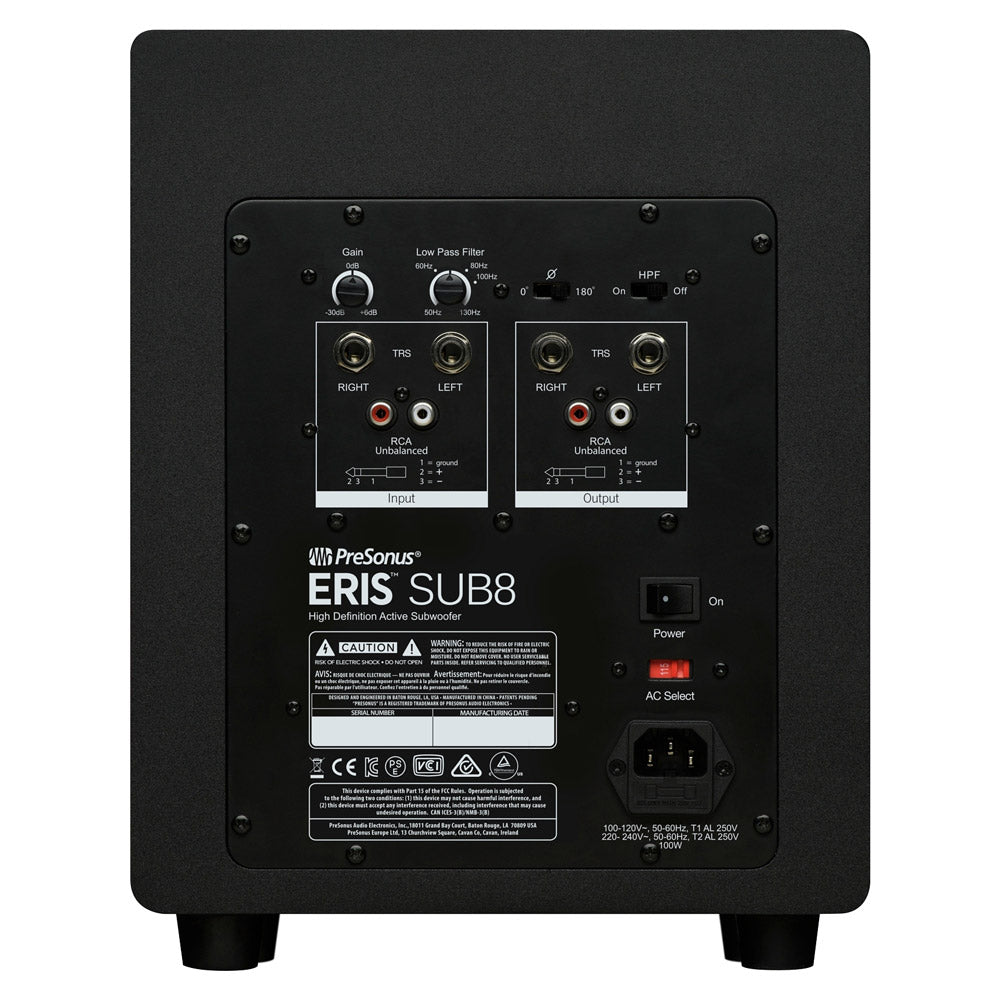 Although compatible with a variety of full-range studio monitors, the PreSonus® Eris® Sub8 compact studio subwoofer was designed to complement the voicing and frequency response of Eris-series studio monitors and media reference monitors. The Eris Sub8 lets you naturally extend the reach of your Eris E3.5, E4.5, E44, E5 and E5 XT monitors in a manner appropriate to smaller rooms - exactly where these monitors excel.