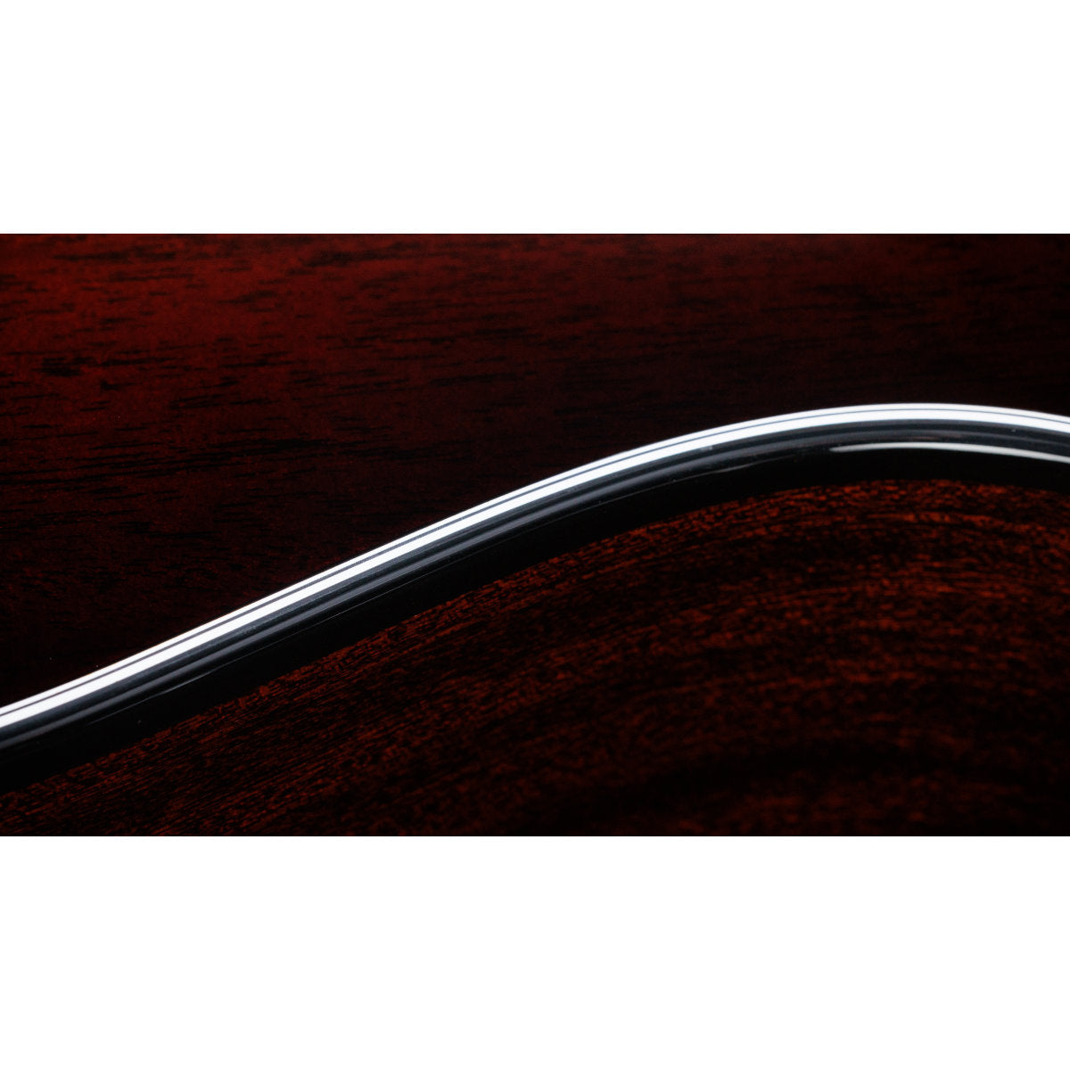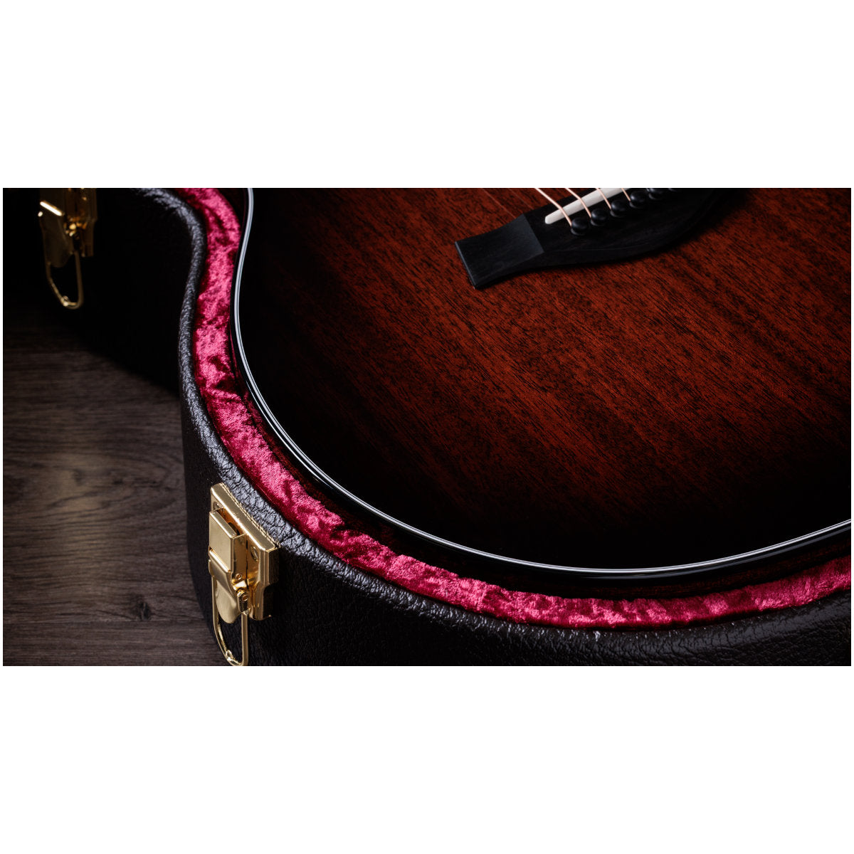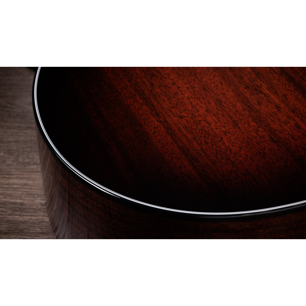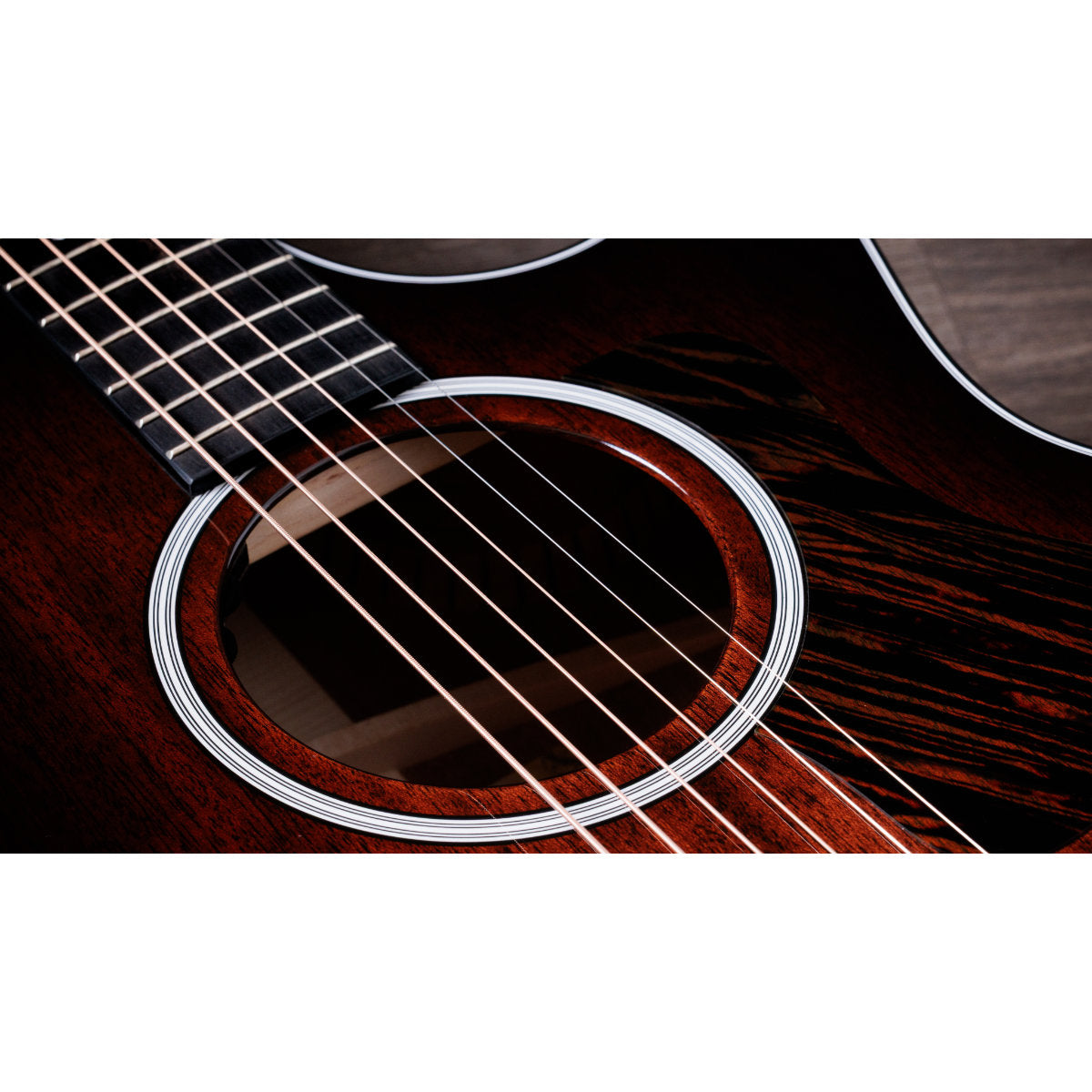 While the 324ce shares the same fundamental appointments that define the next-gen 314ce, the darker mahogany top is accented with other unique aesthetic touches including a shaded edgeburst — giving the white rosette and top purfling lines extra visual pop — and satin black Taylor tuning machines and buttons.