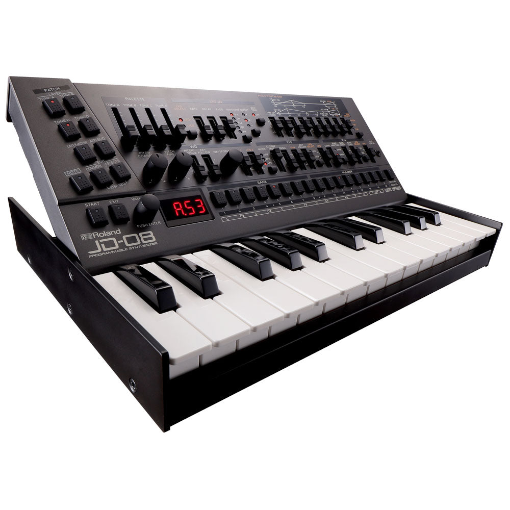 The compact JD-08 fits just about anywhere and is easily controlled from a master keyboard or computer DAW. It can run on standard AA batteries for hours of uninhibited jamming, and there’s also a built-in speaker for on-the-go sound monitoring. Add a DK-01 Boutique Dock for a polished look and three convenient tilt positions, or grab a K-25m Keyboard Unit to create a fully self-contained, portable instrument.