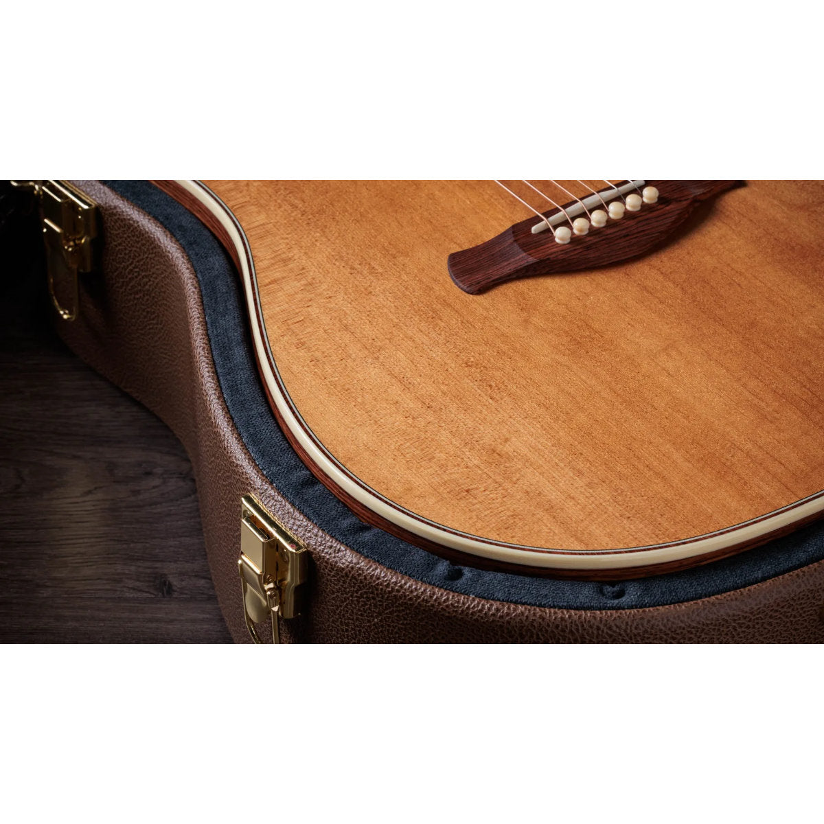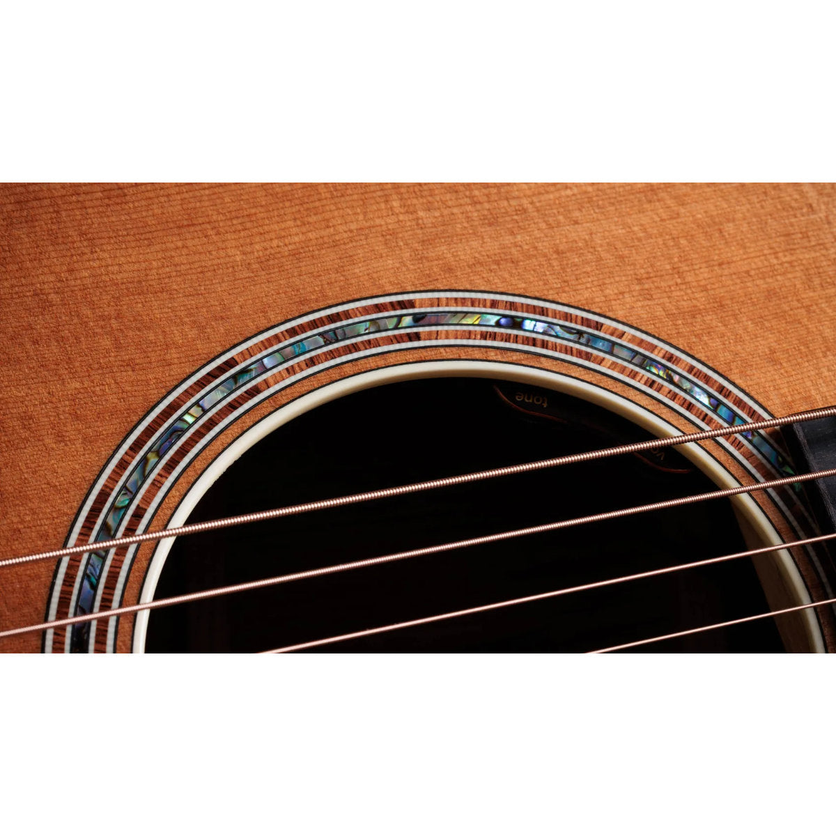 Appointments balance the workmanlike appeal of a Dreadnought with subtle detailing that showcases Taylor’s craftsmanship. The torrefied spruce top adds a golden-brown visual warmth, accented by a rosette of Honduran rosewood and paua shell framed with ivoroid and black purfling. Grained ivoroid body binding is complemented by Honduran rosewood, ivoroid and black top trim, plus an ivoroid-bound soundhole. Other touches include Continental mother-of-pearl inlays, a dual-layered ivoroid/faux-tortoise pickguard featuring a cutout Continental motif, and Gotoh antique chrome tuners with ebony buttons. Onboard LR Baggs Element VTC electronics with discreet soundhole-mounted tone controls and a Taylor deluxe hardshell case round out the package.