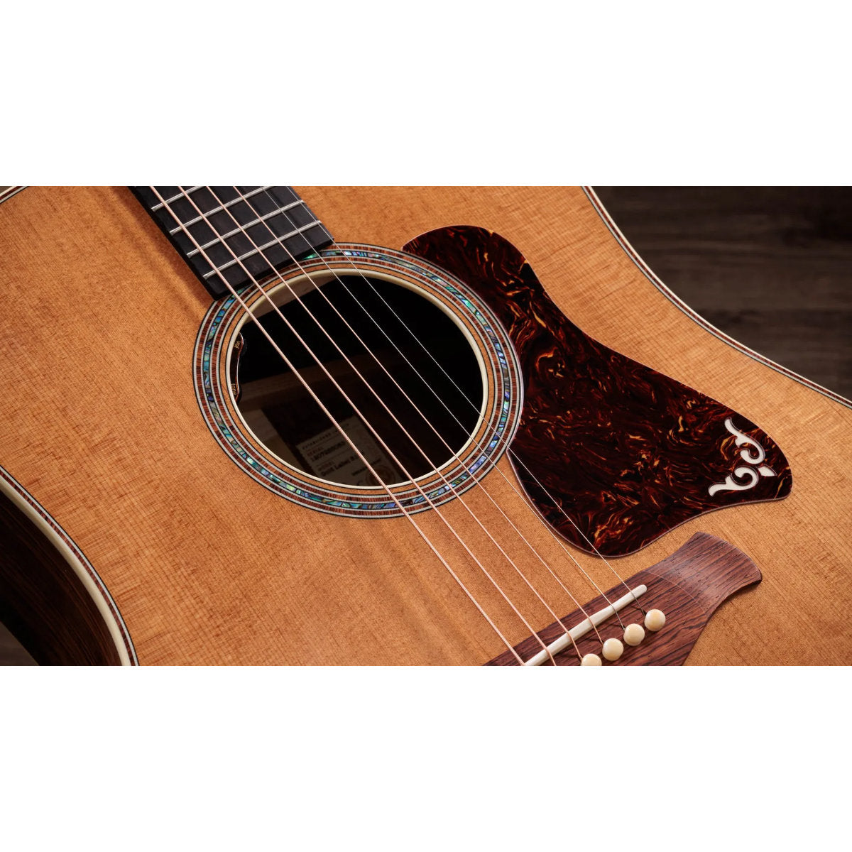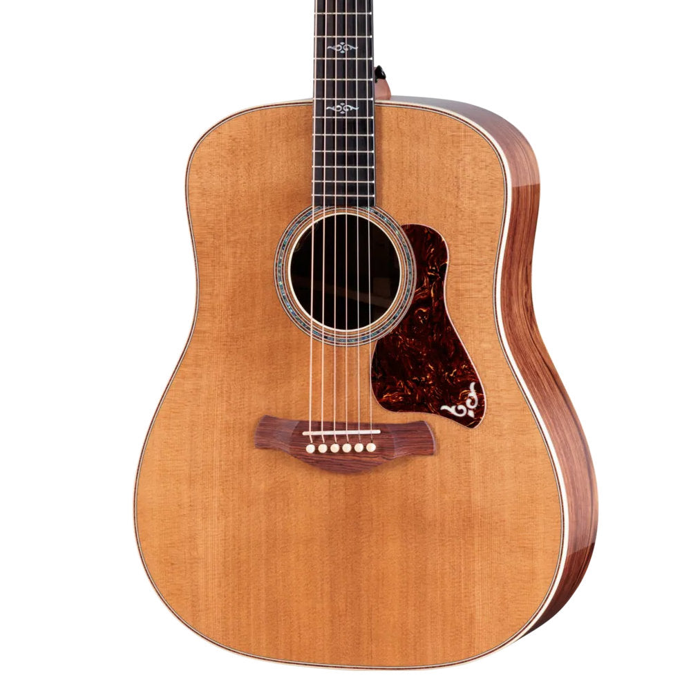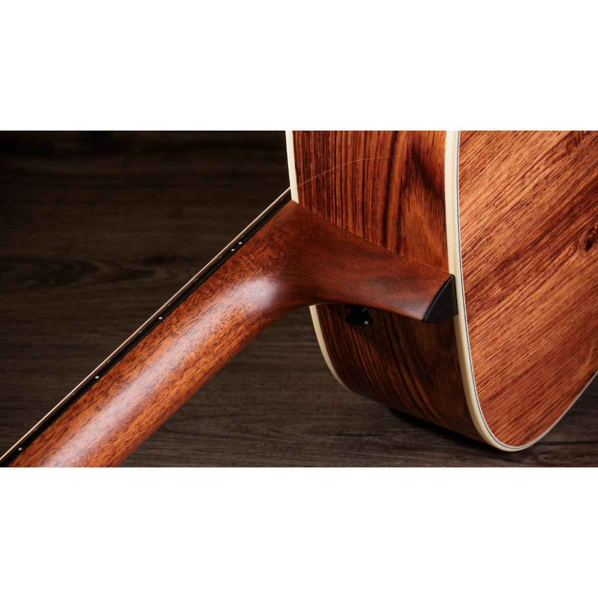 The Gold Label 810e combines Taylor’s deeper square-shoulder Dreadnought body with the dynamic pairing of dense Honduran rosewood and torrefied Sitka spruce. Voiced with proprietary fanned V-Class bracing and hot hide glue, it’s an acoustic cannon with sweeping range, ear-pleasing warmth, and rich detail. The lows are girthy yet clear, the trebles sparkle with depth, and the mids resonate with a musicality that expands the guitar’s tonal palette. Taylor’s patented long-tenon Action Control Neck enhances tonal transfer between neck and body, adding warmth, while its adjustable design lets players fine-tune string height on the fly. Fans of traditional Dreadnoughts will appreciate how the Gold Label approach marries classic sounds with modern refinements that make it easier than ever to hit your musical stride.