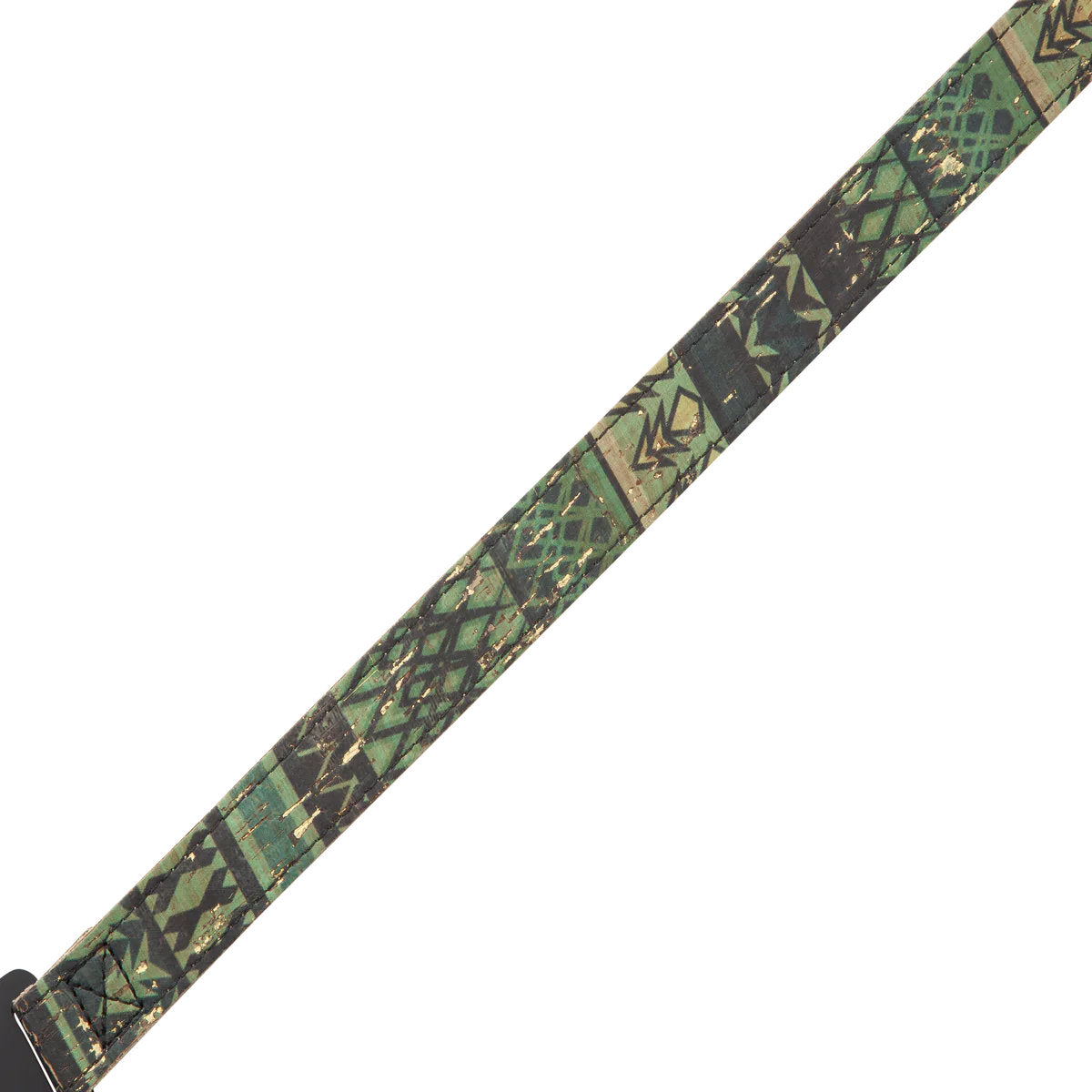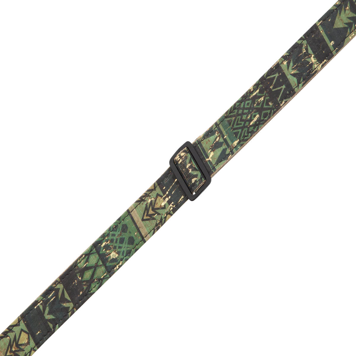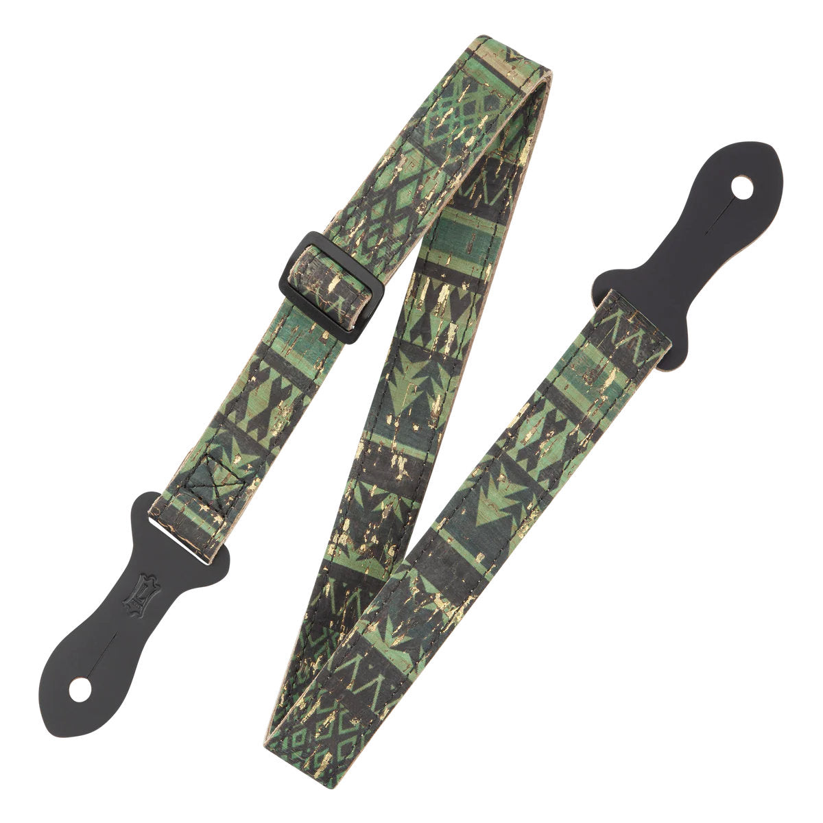- Two-ply natural cork ukulele/classical strap with chrome tan leather center and single hook sound-hole attachment. Black plastic loop and slide hardware. Adjustable to 27".