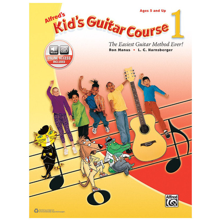 Alfred's Kid's Guitar Course is a fun method that teaches you to play songs on the guitar right away. Each lesson on every colorful page is explained in plain language that's easy to understand, and accompanying audio that you can stream or download online is included so you can hear what each example should sound like. Plus, you get to learn from three irresistible guitar experts---a clever, classical dog, one cool jazz cat, and a friendly alligator who loves the blues. They draw attention to what's important on each page and help you learn by making music fun! Parents can be effective guides to help you through this course, even if they've never had any musical training themselves.