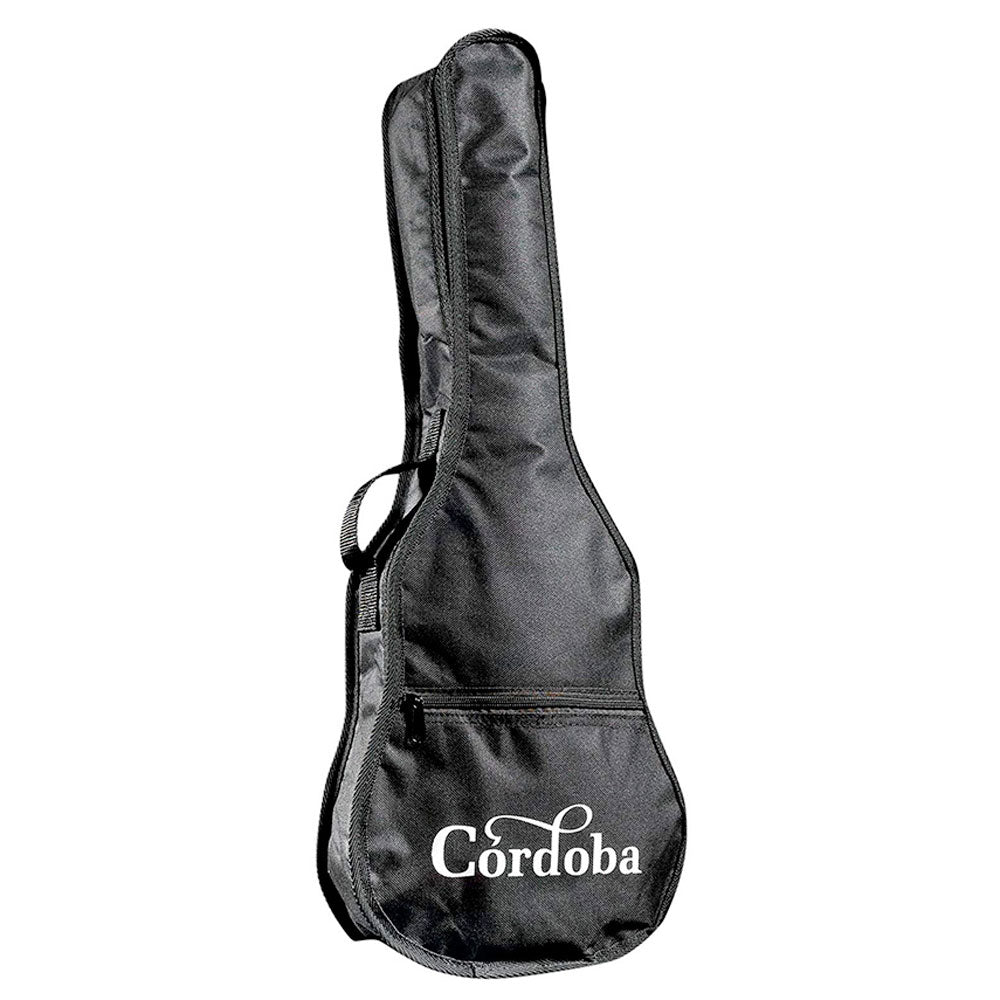 Lightly padded soft ukulele gig bag in black with two side handles, front pocket, and screen-printed white Córdoba logo.