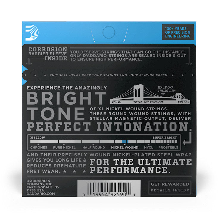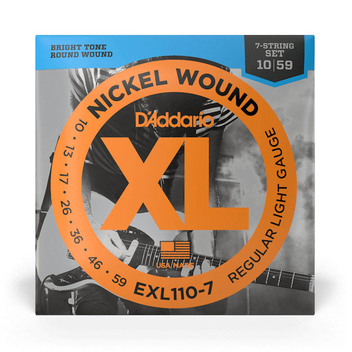 EXL110-7 is D'Addario's best-selling 7-string electric guitar set. XL Nickel Wound electric guitar strings, long recognized as the industry standard, are ideal for a wide range of musical styles.