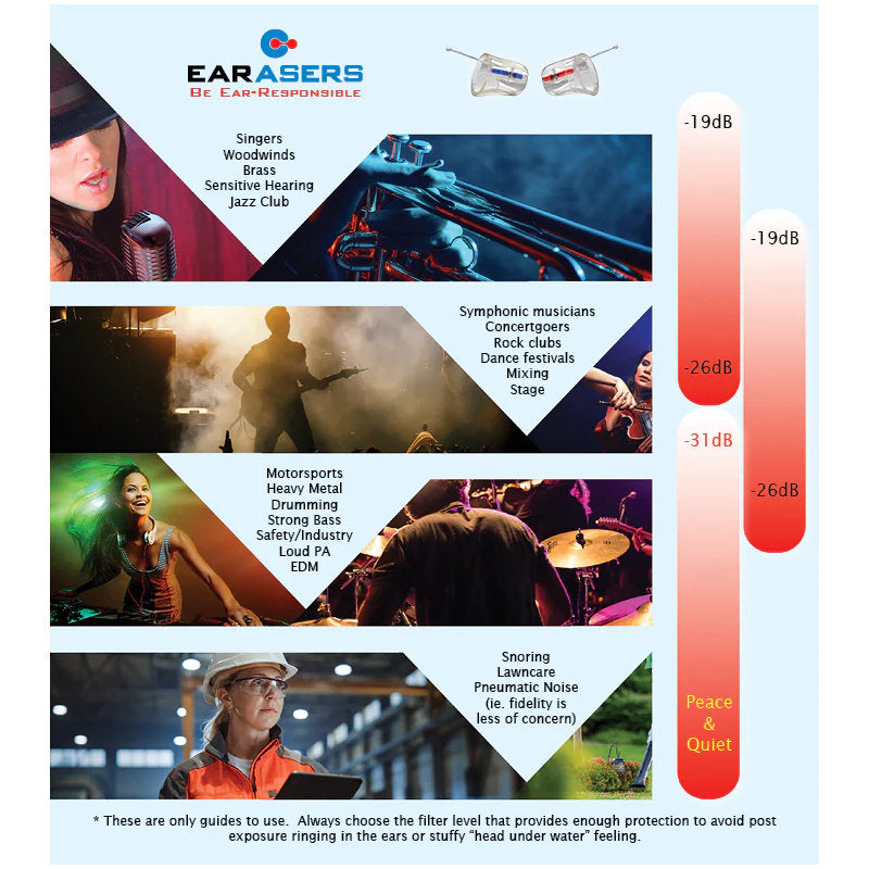 Whether you are a musician, attend concerts or are regularly exposed to music played at high levels, Earasers don't plug up your ears and muffle sound like conventional earplugs. Manufactured by a 57 year old hearing aid company, and developed by their lead engineer - a musician for over 35 years, Earasers filter out loud noise while still allowing you to hear at a safe, comfortable level. Protect your hearing and still maintain communication with those around you. If you enjoy going to concerts or just jamming out with the band, these earplugs will take care of your ears. Earasers are so comfortable they don't sweat, or tickle, or itch allowing you to enjoy the show for hours on end. The patented construction makes these high fidelity earplugs appear virtually invisible and help you focus your attention on the music.