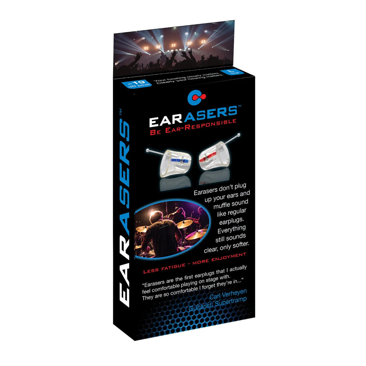 Whether you are a musician, attend concerts or are regularly exposed to music played at high levels, Earasers don't plug up your ears and muffle sound like conventional earplugs. Manufactured by a 57 year old hearing aid company, and developed by their lead engineer - a musician for over 35 years, Earasers filter out loud noise while still allowing you to hear at a safe, comfortable level. Protect your hearing and still maintain communication with those around you. If you enjoy going to concerts or just jamming out with the band, these earplugs will take care of your ears. Earasers are so comfortable they don't sweat, or tickle, or itch allowing you to enjoy the show for hours on end. The patented construction makes these high fidelity earplugs appear virtually invisible and help you focus your attention on the music.
