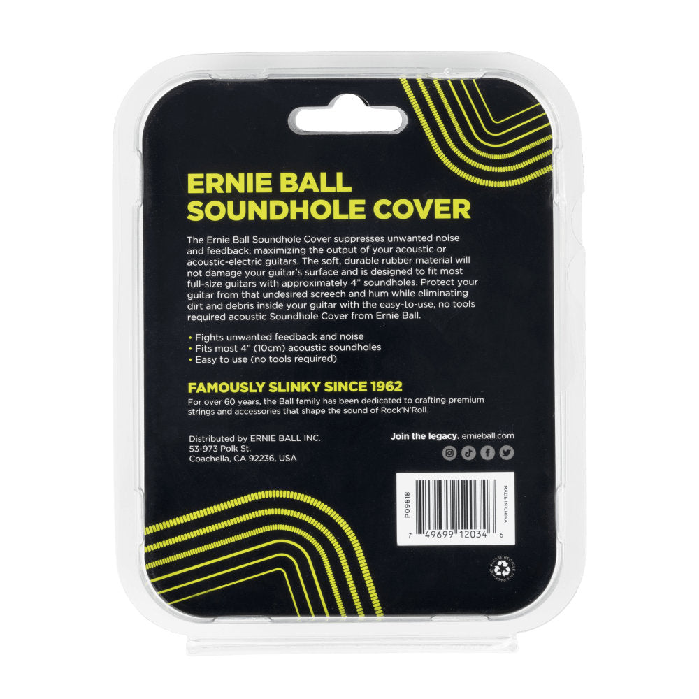 The Ernie Ball Soundhole Cover suppresses unwanted noise and feedback, maximizing the output of your acoustic-electric guitars. The soundhole cover is designed to fit in most acoustic soundholes, while the durable rubber material is soft and will not damage your guitar’s surface. Protect your guitar from that undesired screech and hum while eliminating dirt and debris inside your guitar with the easy-to-install, no tools required acoustic soundhole cover from Ernie Ball!