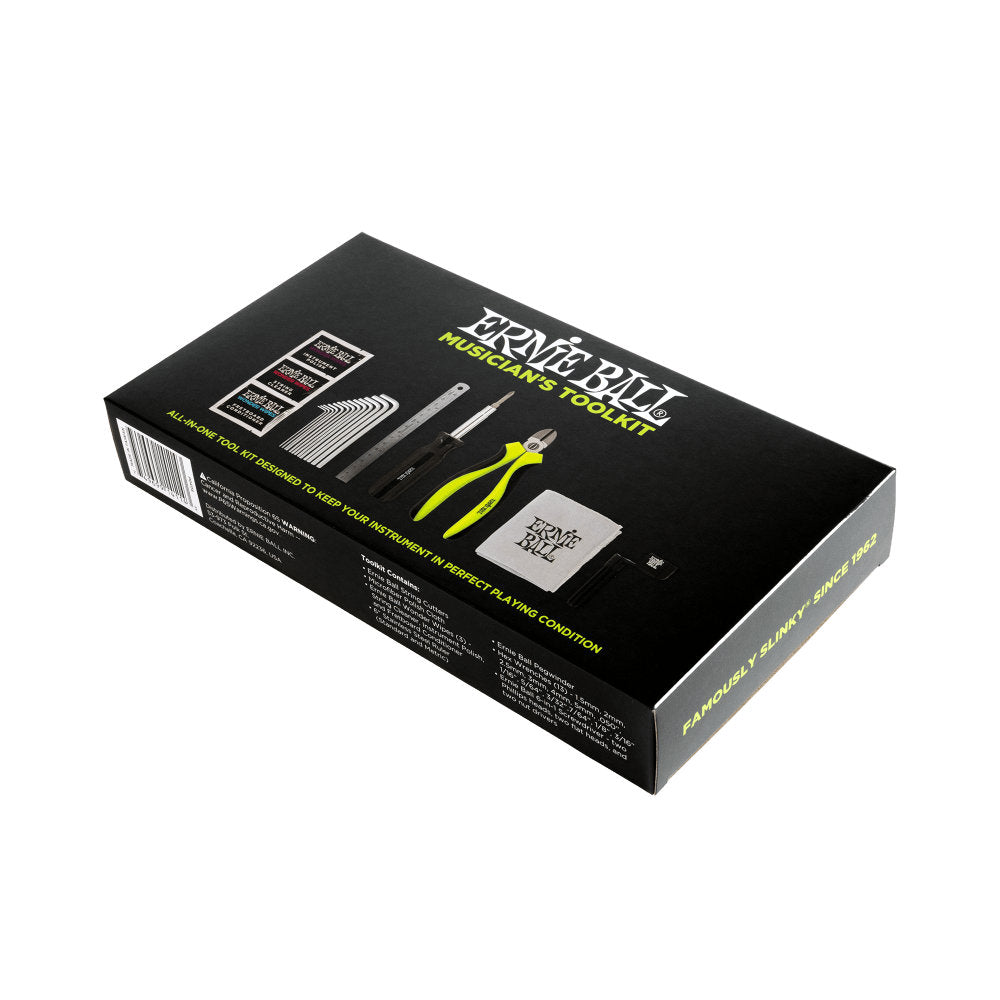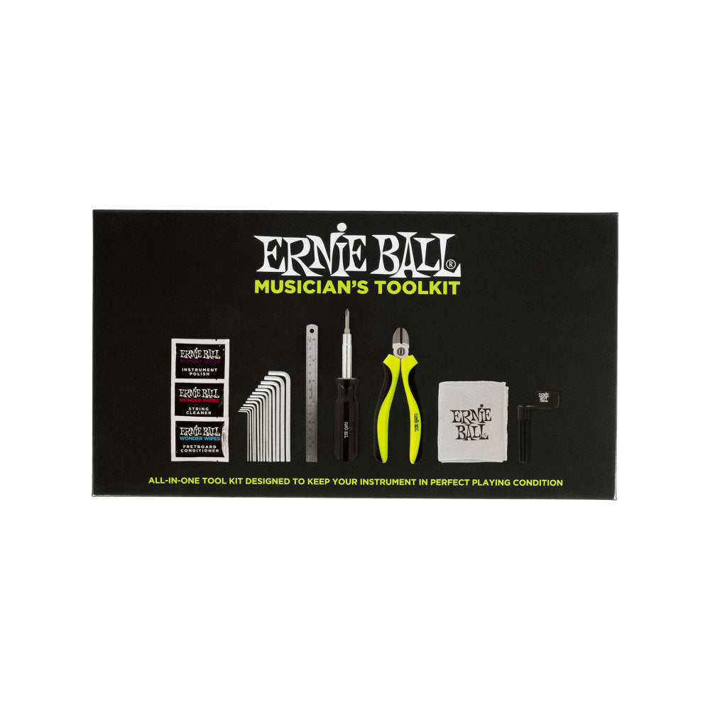 Ernie Ball's all in one tool kit is perfect for cleaning, maintaining and keeping your instrument in perfect playing condition. Change strings, set intonation, adjust the action, check string height and more. Tool kit includes Microfiber Polish Cloth, Wonder Wipes, Heavy Duty String Cutter, Peg Winder, 6-in-1 Screwdriver, Ruler, and durable Hex Wrench Set.