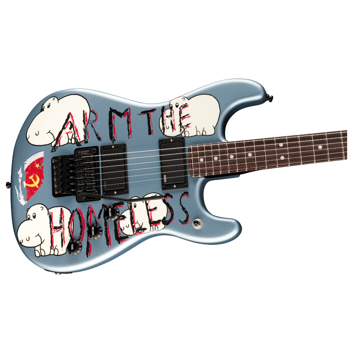 As architect of Rage Against the Machine's groundbreaking sound, Rock 'n' Roll Hall of Famer Tom Morello revolutionized guitar with his monstrous riffs and boundary-breaking techniques. His heavily modified 'Arm the Homeless' guitar became legendary and has been his primary instrument for over 35 years, channeling everything from delicate jazz phrases to searing metal riffs through its distinctive active electronics and Gotoh® double-locking tremolo system. Adorned with its provocative slogan and his own hand-drawn hippopotamus design against its striking blue ice metallic finish, this guitar masters its role as an instrument to become a powerful symbol of artistic rebellion. Every component, including its characteristic hockey stick headstock and powerful visual messaging captures Morello's unwavering commitment to musical innovation and social change.