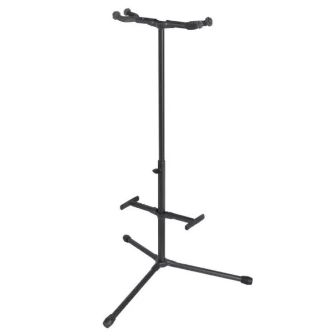 Keep two guitars easily accessible, safe, and blemish free with On-Stage's GS7255 Hang-It Double Guitar Stand. The height-adjustable guitar hangers and stabilizing bumpers accommodate any traditionally shaped guitar including acoustic, electric, and bass. Padding on the yokes and bumpers protects the guitar finishes. A wide tripod base provides stability and balance for dependable instrument support. For efficient storage and transportation, the base, yokes, and bumpers fold down.