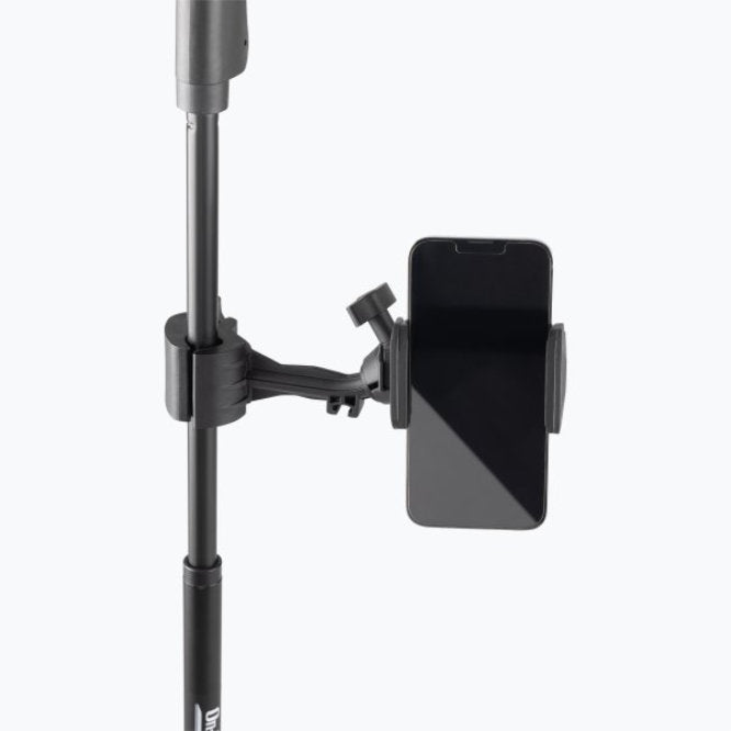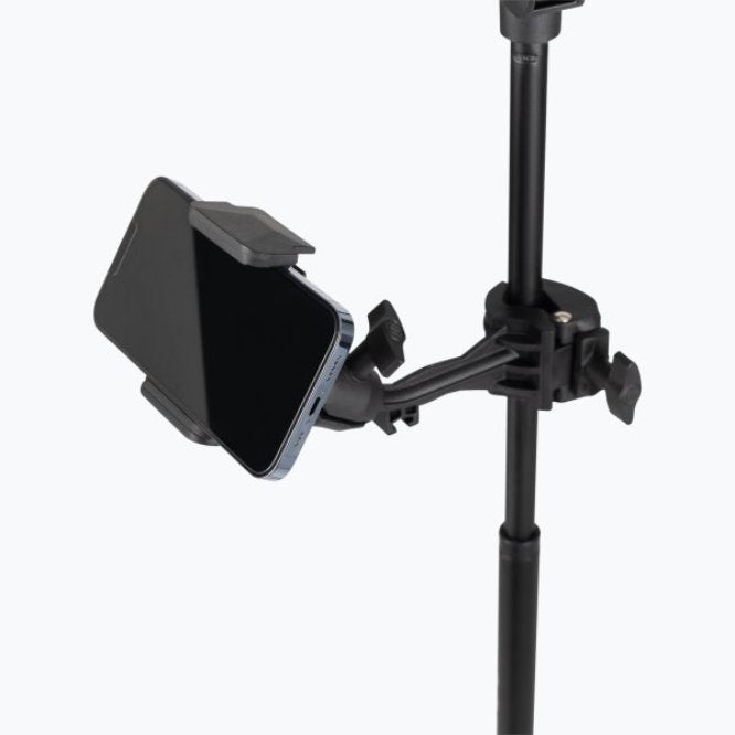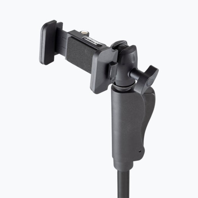 The TCM500 Smartphone Holder for Mic Stands securely attaches to a mic stand and holds a smartphone for ease of reading music or lyrics, live streaming, or creating audio/visual content. This space-saving holder makes it possible to mount a phone in a convenient location for practice, performance, streaming, or recording without setting up an extra stand. The ball joint on the phone clamp provides the option to mount the phone for use in portrait or landscape modes. It also enables rotation and tilting of the phone to further dial in just the right angle for comfortable viewing or for streaming or recording video. The phone clamp adjusts in size to ensure a snug fit for a wide range of phones up to 4 inches in width. Padding on the clamp protects phones from scratches and dents while providing traction for a secure, stable grip to keep phones safely in place. With its black finish, this versatile accessory adds to a professional presentation in any venue, recording studio, or streaming setup.