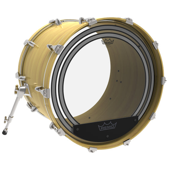 Powersonic® Clear Bass drumheads feature focused lows with increased attack. Constructed with 2-plies of 7-mil and 5-mil Clear film, Powersonic® Clear bass drumheads provide two specifically placed subsonic dampening rings and external snap on dampening system with impact patch for more attack. The external snap on dampening system allows you to customize you sound for different playing situations. Available is sizes 18" - 24".
