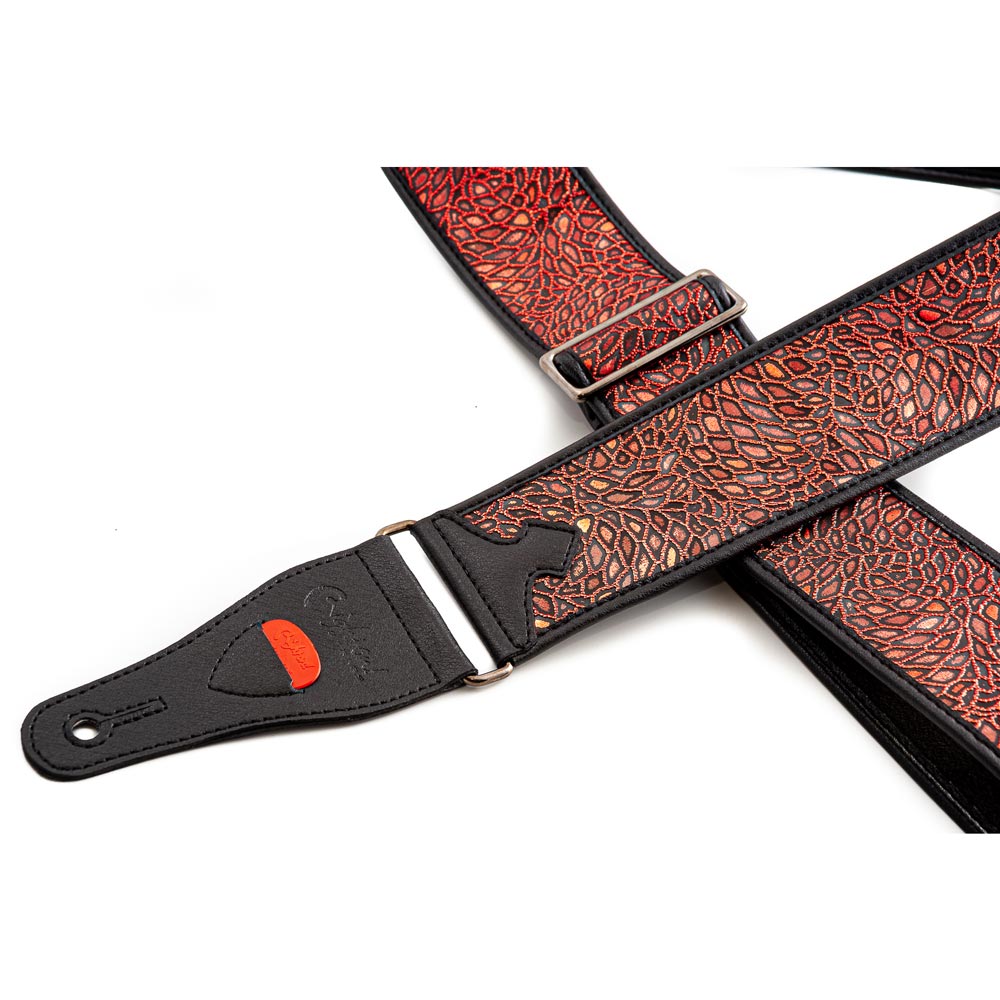 Exquisite deluxe guitar strap, wide and padded, with unique "alien" red pattern. 100% animal free.