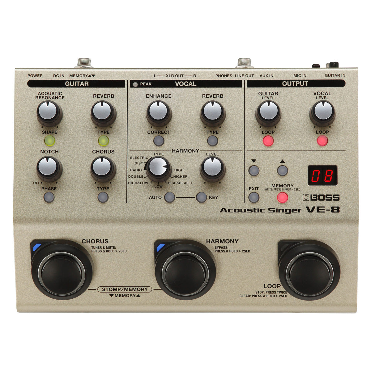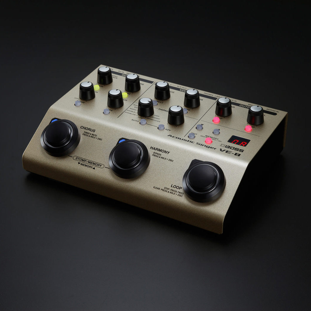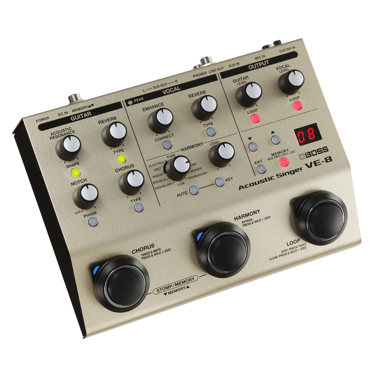 For singer/songwriters who play acoustic guitar, it’s a competitive, crowded world out there. The VE-8 Acoustic Singer delivers that extra edge you need to stand out and shine, supporting you with professional BOSS sound every time you perform. Simple to use, the VE-8 provides studio-quality voice and guitar processing plus impressive real-time harmonies and looping in one compact, go-everywhere package. With such great sound and powerful creative features at your command, you’re destined to bring down the house everywhere you play.
